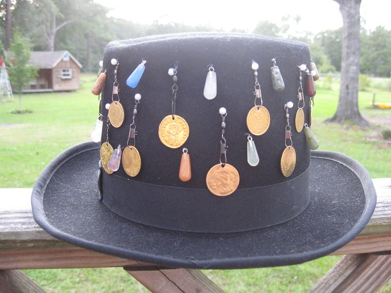 My current hat is but a sad shadow of its former glorious self. It used to be the "Holey Gold Hat", before I got laid off in the Great Recession and had to sell all my baubles in order to survive. Now it is merely the "Holey Coin Hat" (no gold). But I've still got some fun holey pieces on there.