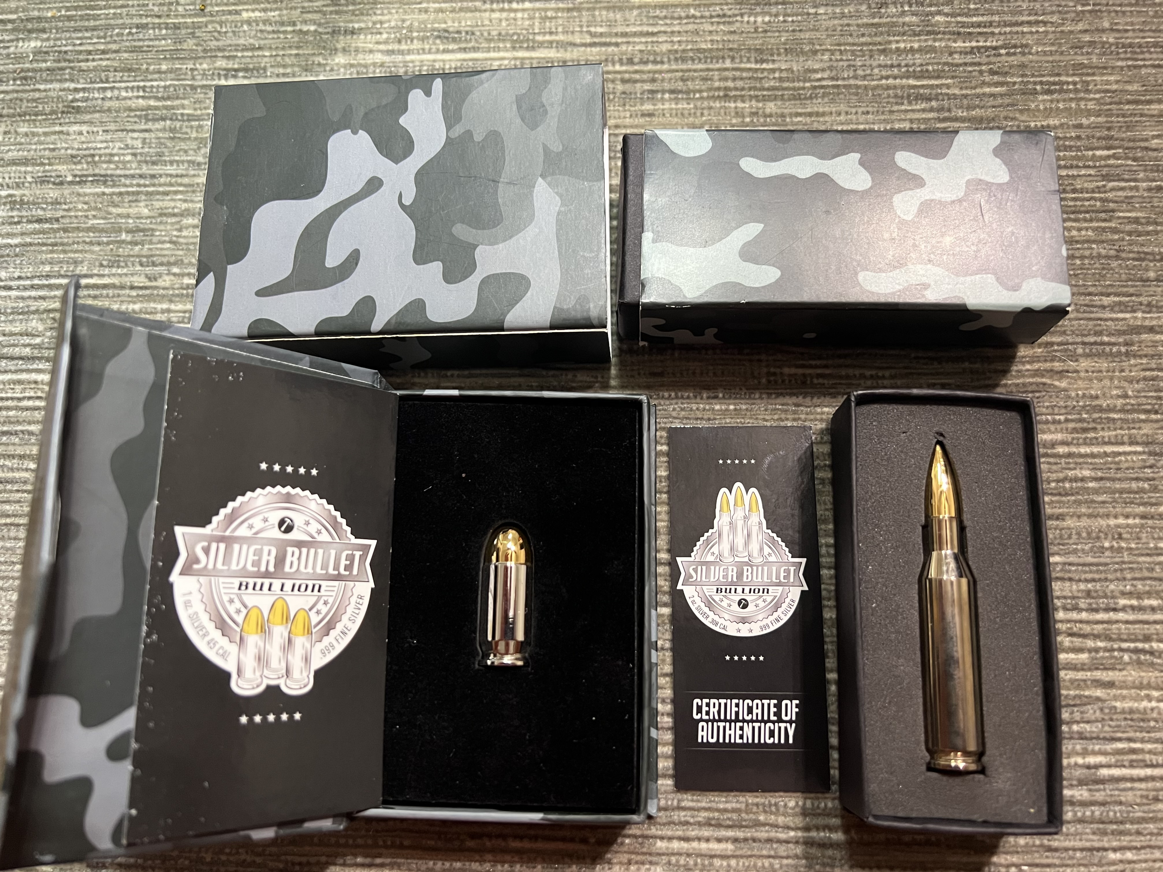 Silver ingot (2OZ) .308 & (1OZ) 45 Cal Rhodium & 24K gold gilded ingot .999 fine silver