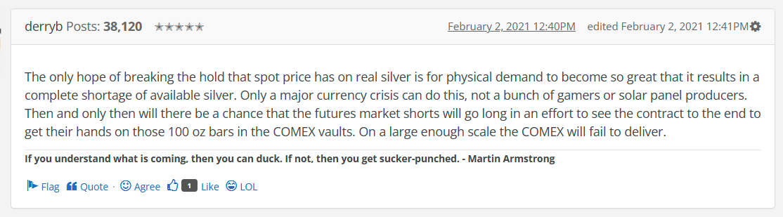 I'm saying it's plausible. Not prepared to assert that it's definitely true. As I wrote earlier, I am not informed enough to draw any firm conclusions. All I know is that this time a year ago, silver was just under $30/oz; in June, it was around $40/oz, and it's currently checks Kitco almost $72/oz! That's not normal...
