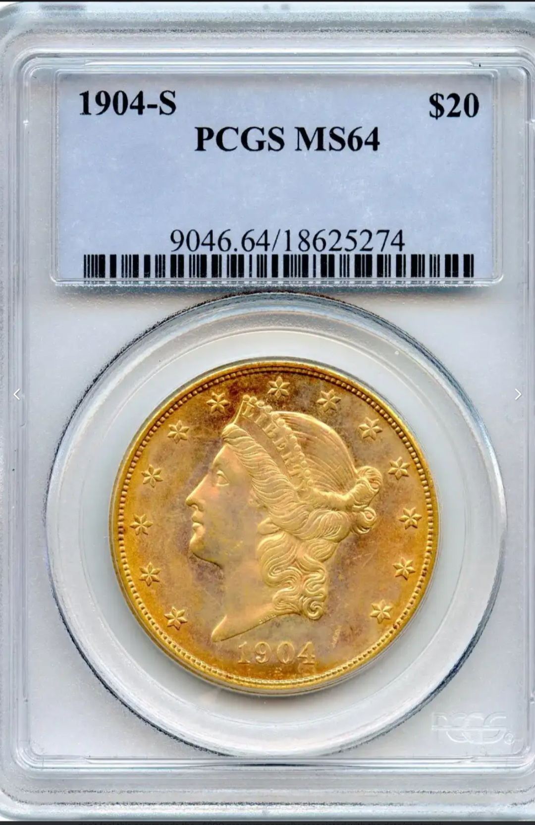 For sale is a 1904-s double eagle graded MS64 by PCGS. Coin has clean surfaces but the obverse is a little hazy. Selling for over $30 below melt.