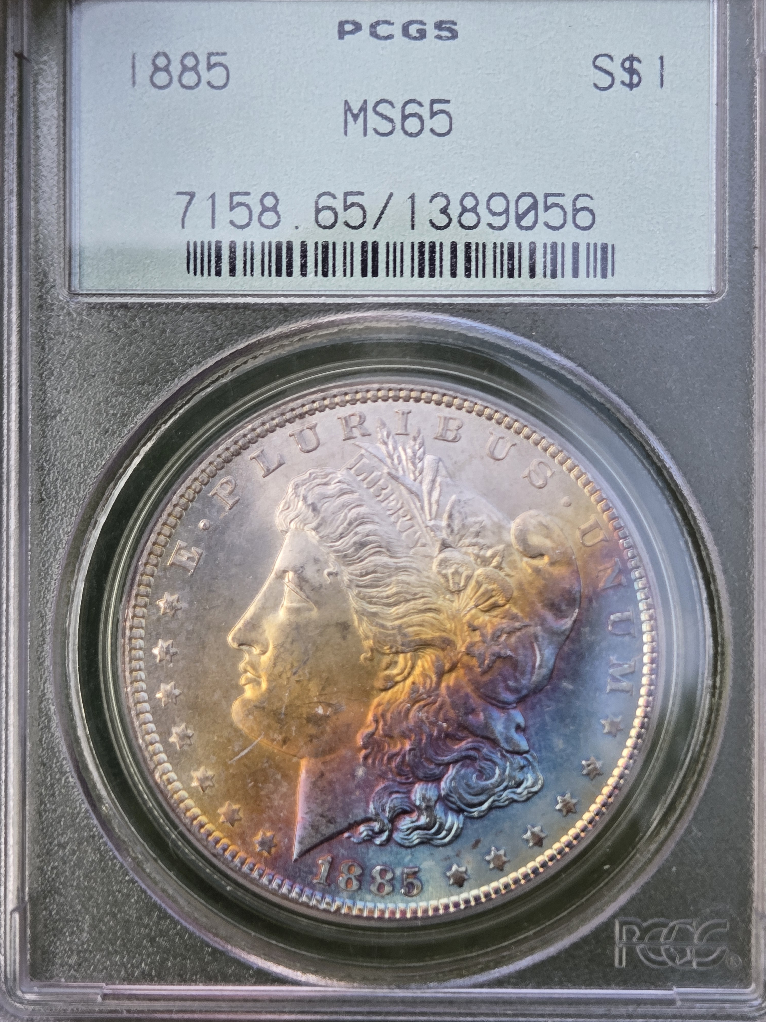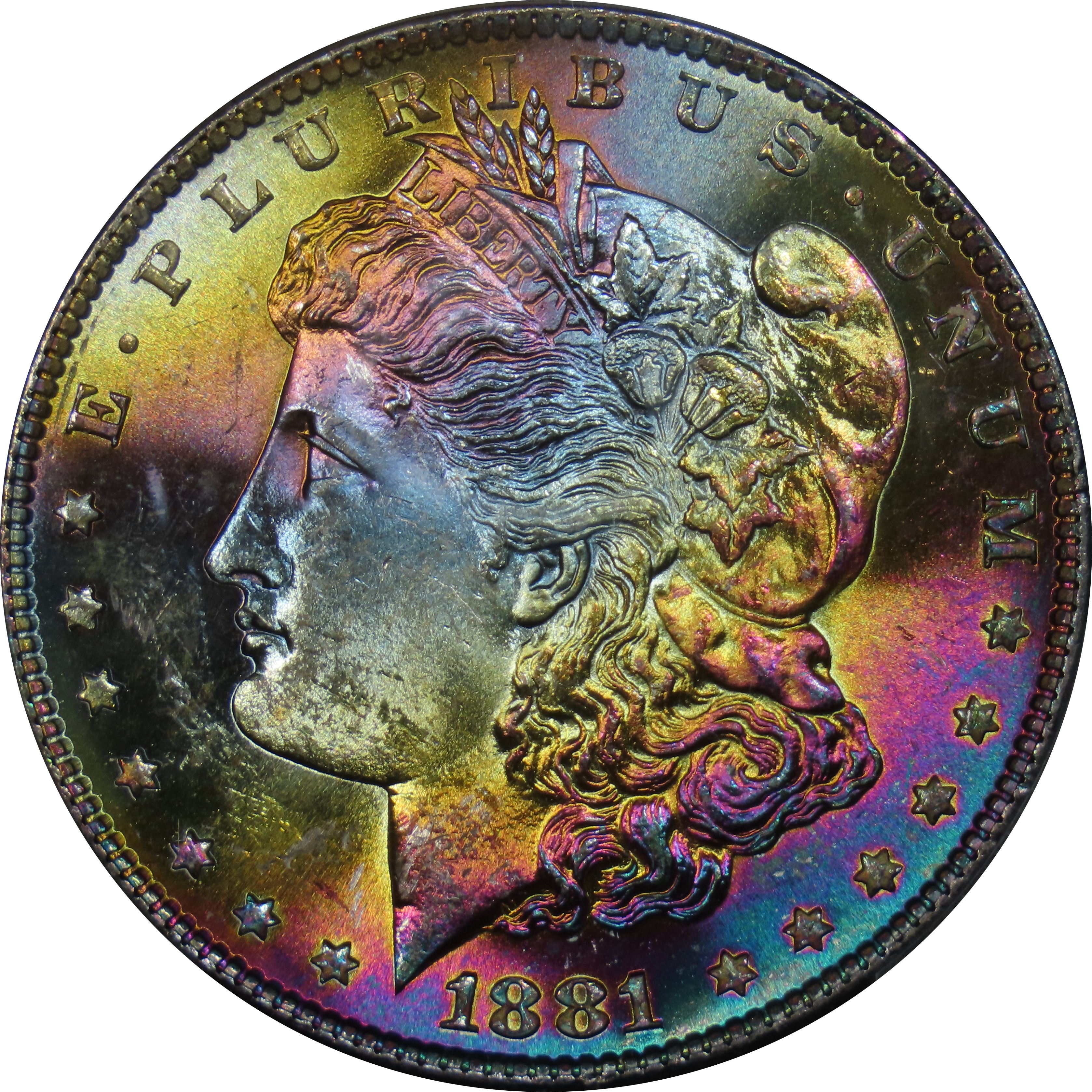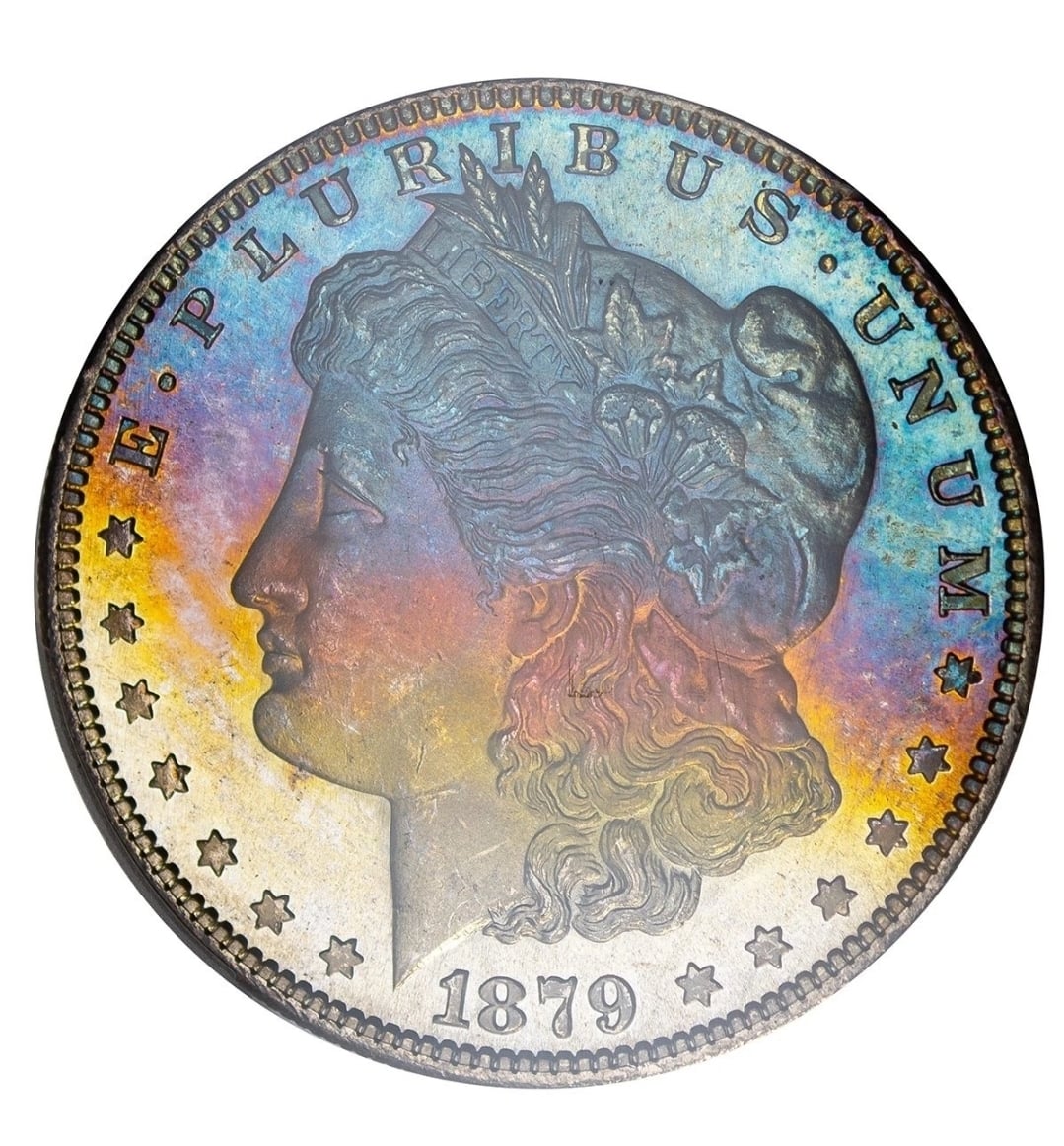There are some beautiful coins posted here. Here's one from my collection of rainbow toned Morgan dollars. Acquired about 10 years ago from, appropriately, a Stack's auction sale.