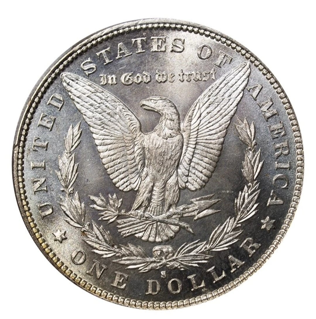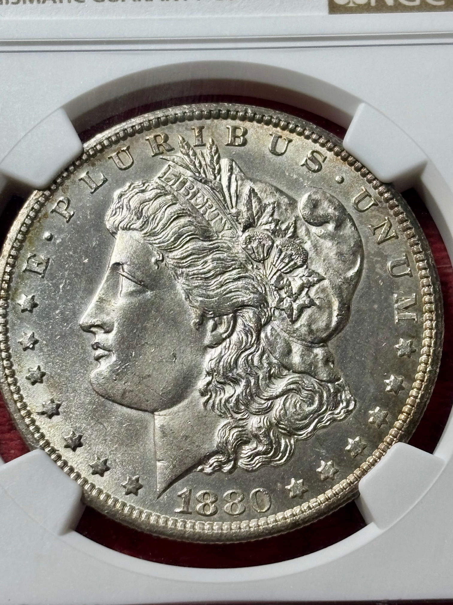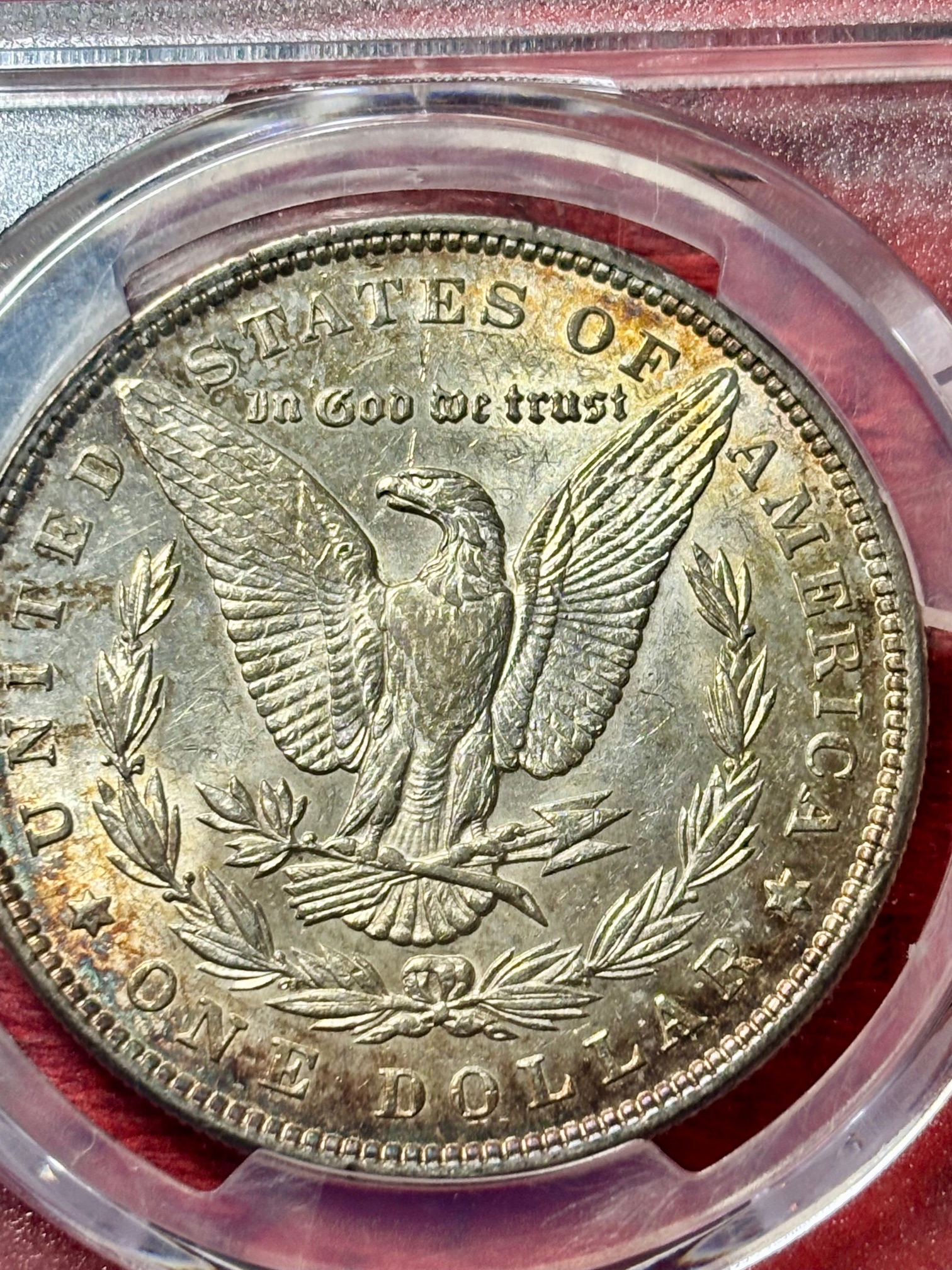 This Morgan is semi-proof like (maybe pl) with a strong cameo on the obverse and reverse. I really like the trace of purple!