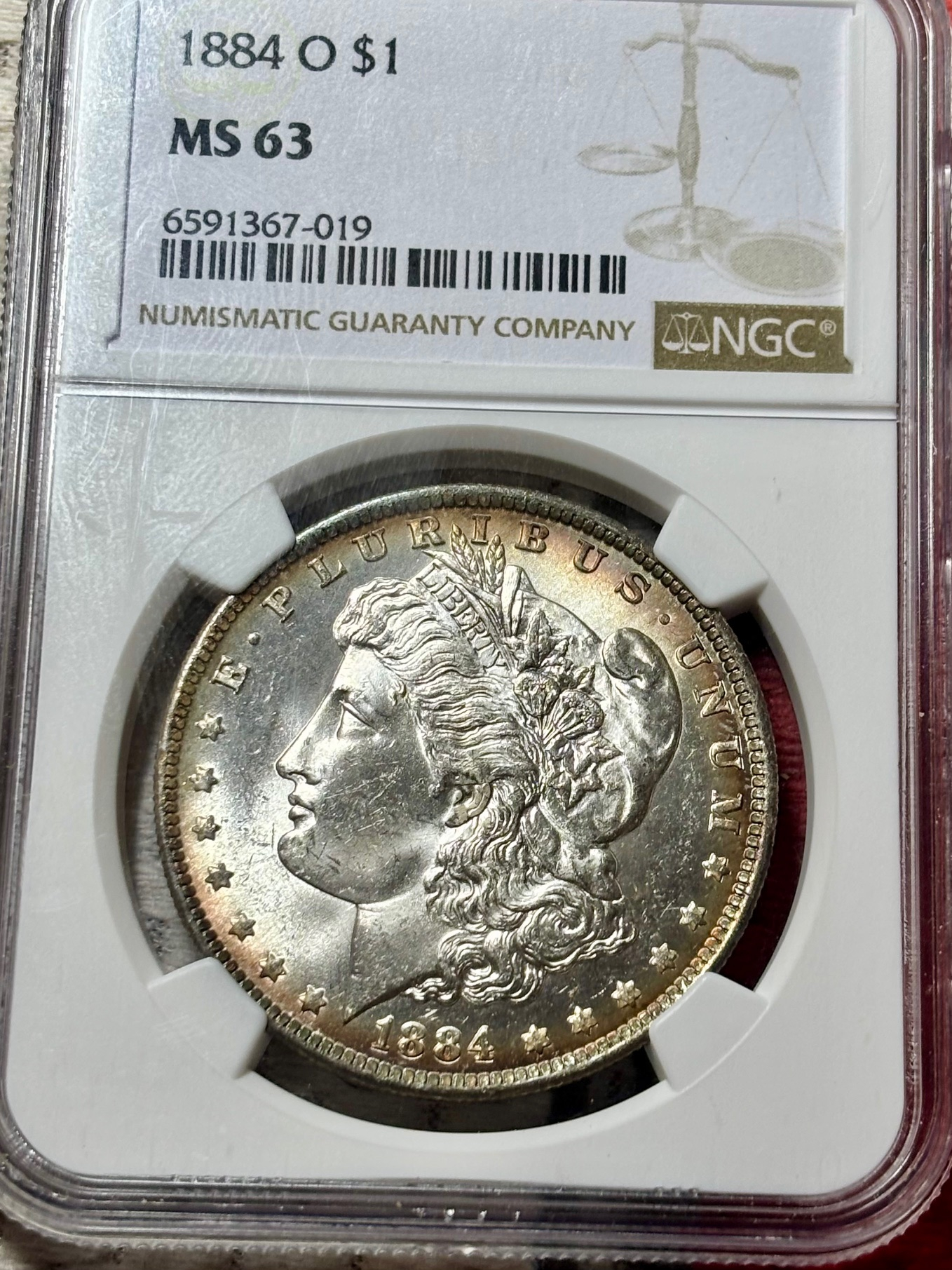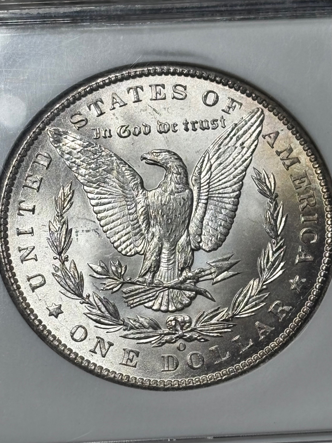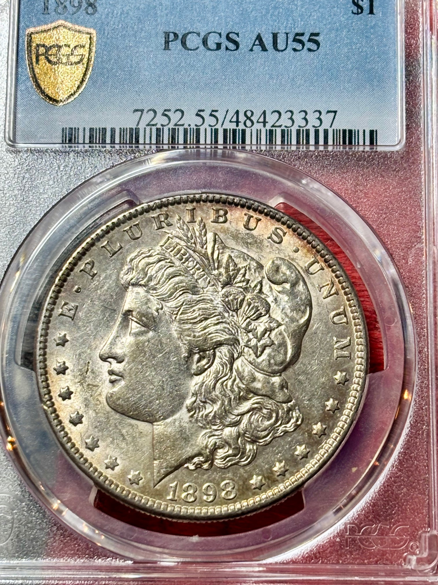 This Morgan is semi-proof like (maybe pl) with a strong cameo on the obverse and reverse. I really like the trace of purple!