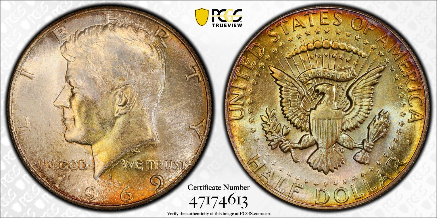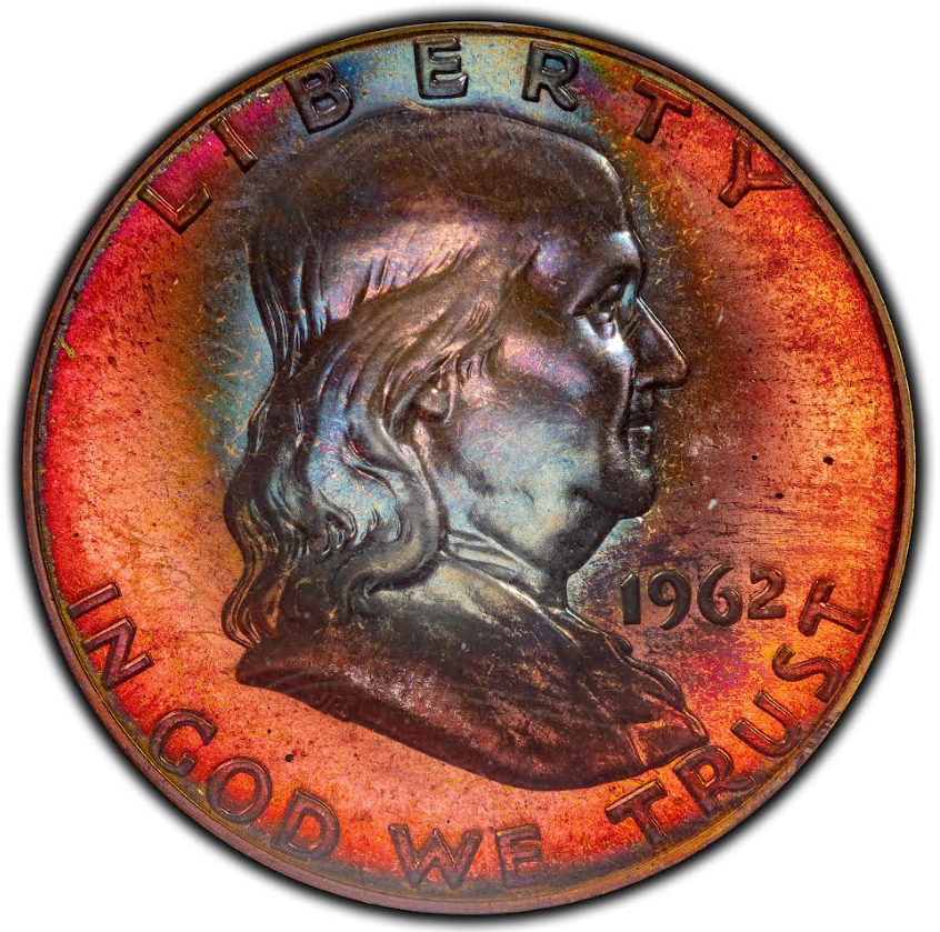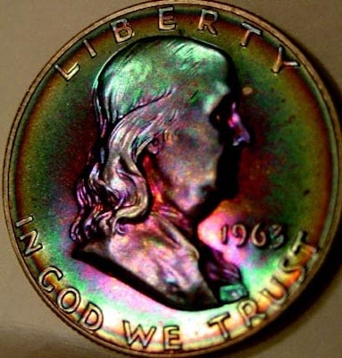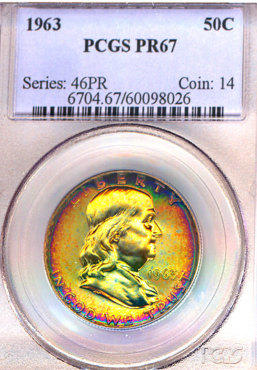 Gem Proof Franklin half dollars with rainbow colors are very hard to find. Here's one, a 1963 graded PCGS proof 65.
