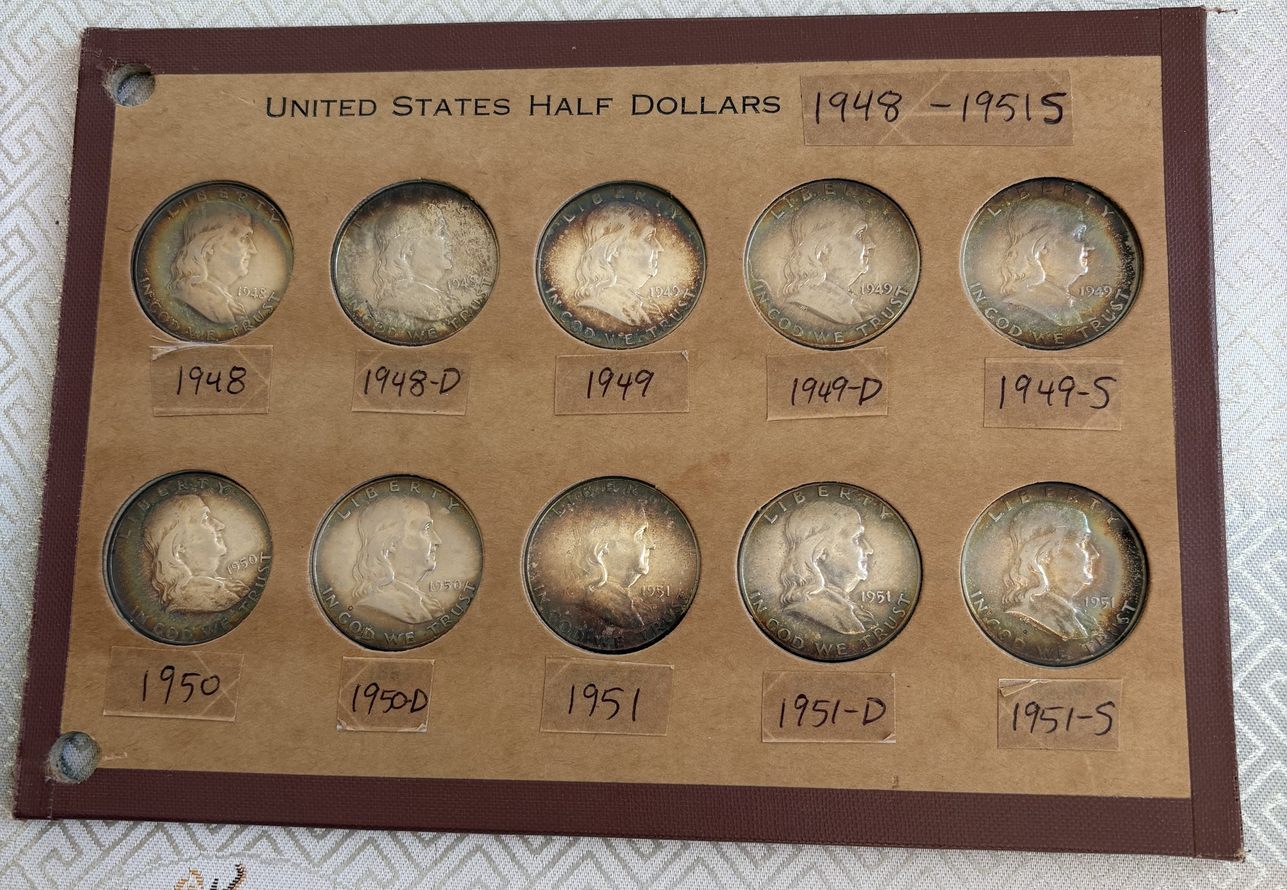 I purchased a Wayte Raymond album over twenty years ago. It contains about five pages of toned Franklin half dollars. The coins shown are from the first page.