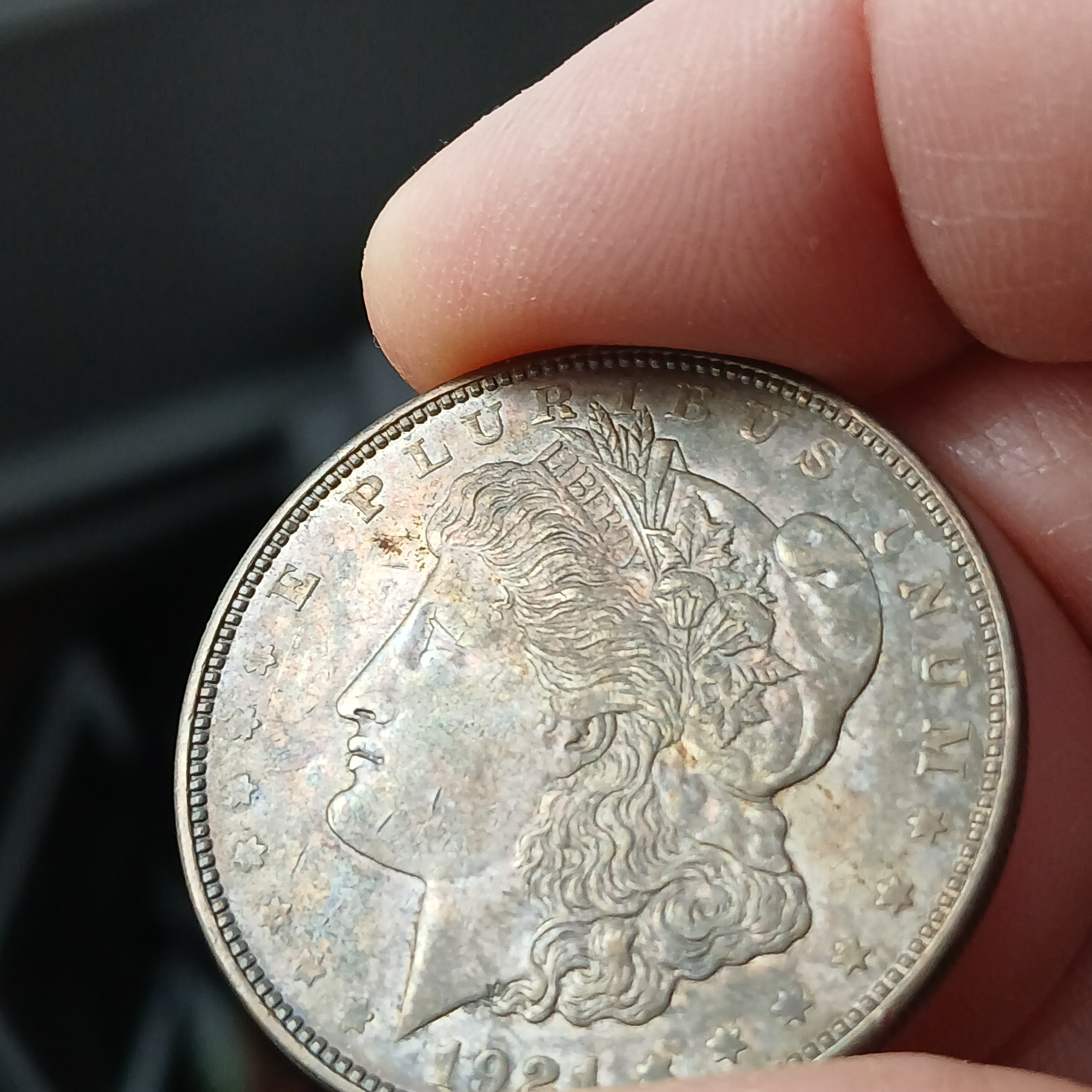 Rarely seen toned 1921-D. I bought this coin that was stored in an envelope for decades. Id say its AU/CU.