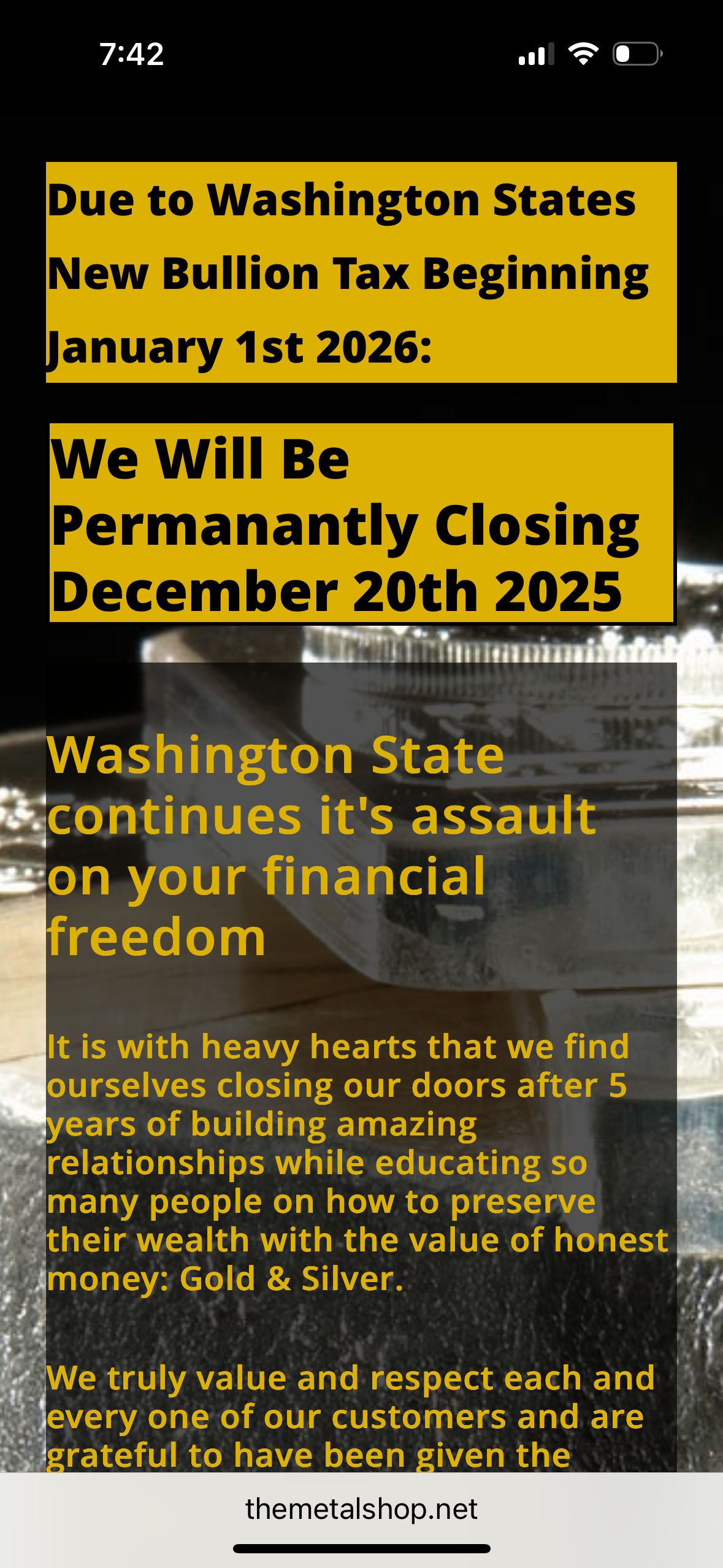 the wa state situation has been a subject on the coin forum. apparently wa doesn't need an income tax because they tax everything else. this change in the tax is new. it's not just bullion. expect more closures.