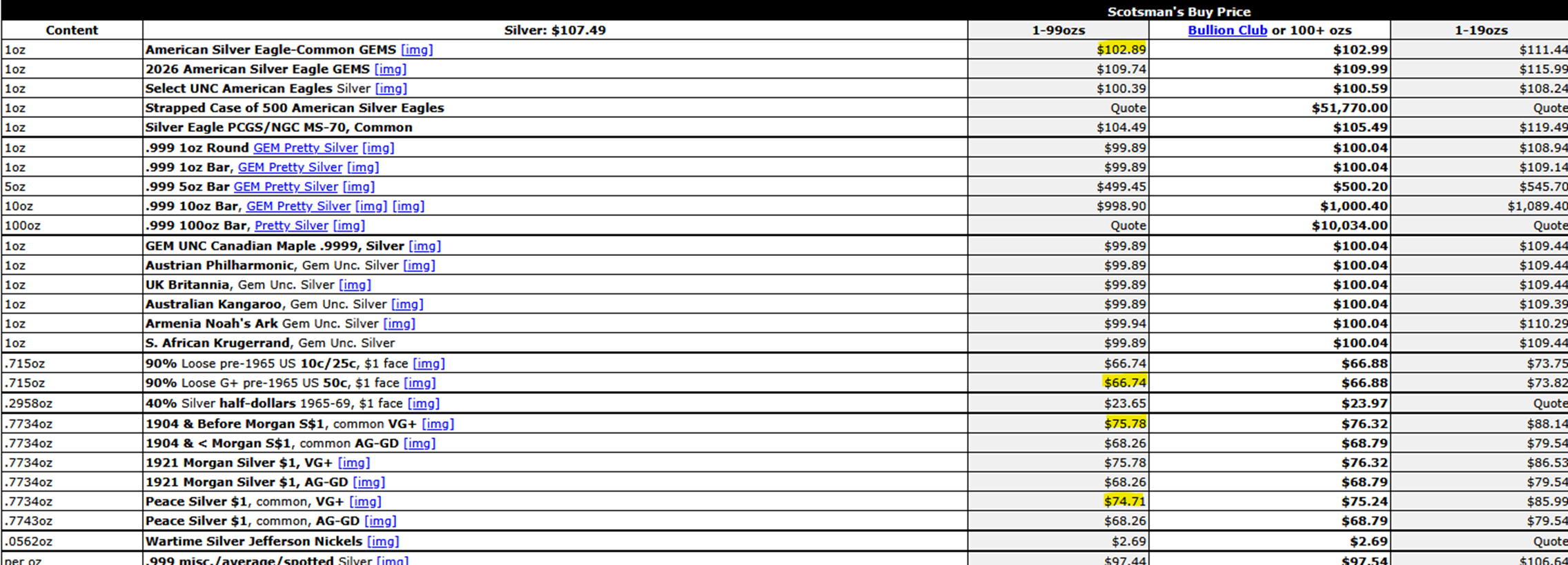 I can't use 90% silver now as my example because Scotsman isn't publishing it, so I am using VG+ Morgan Dollars as my example instead.