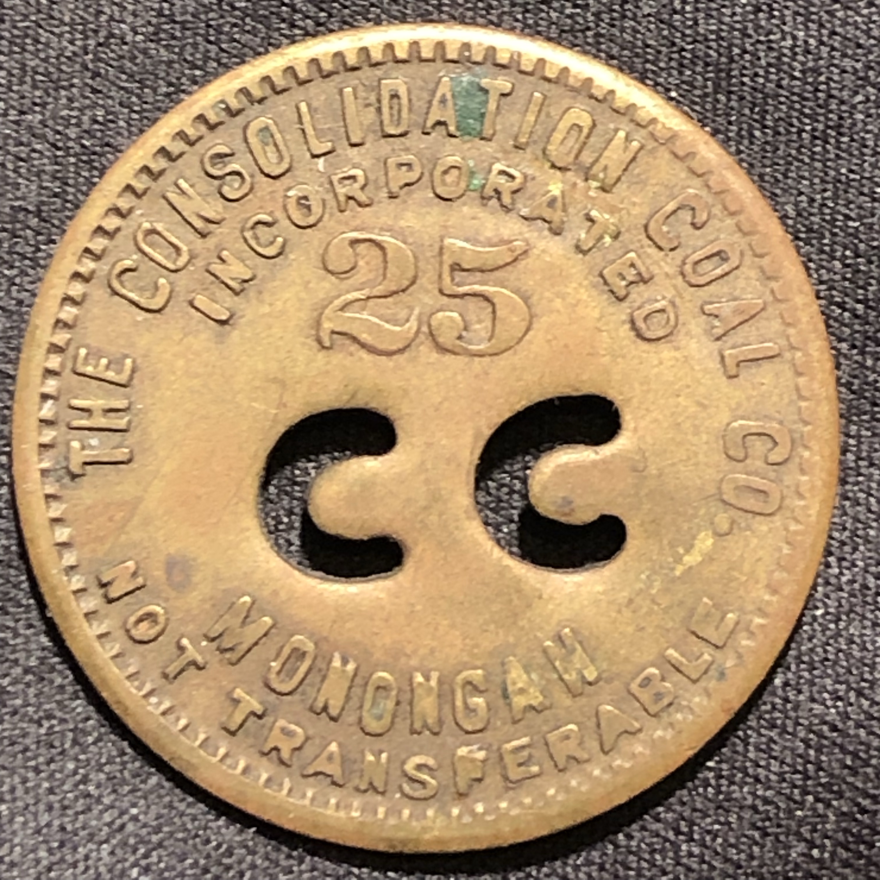 In this case yes, it does stand for Consolidation Coal but in most cases the cut-out will be a shape unique to that company at that location. Some companies had multiple mines at various towns and used a different shape cut-out at each location for separate accounting. Where there were multiple mines of different ownership in the same town or area the cut-outs helped the mines and the local merchants keep things straight at a glance. Some stores were exclusive to a mine and would only accept scrip from that mine (the proverbial company store) while other merchants in town that accepted scrip would decline the tokens from mines on shaky financial footing where they might not be redeemed..