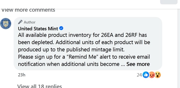 The mint posted that they did not make the full production of both silver eagle coins (as many here already know), and will make the full amounts now, so anyone who missed out gets a second chance. There were many unhappy campers who posted after the mint said it on facebook: