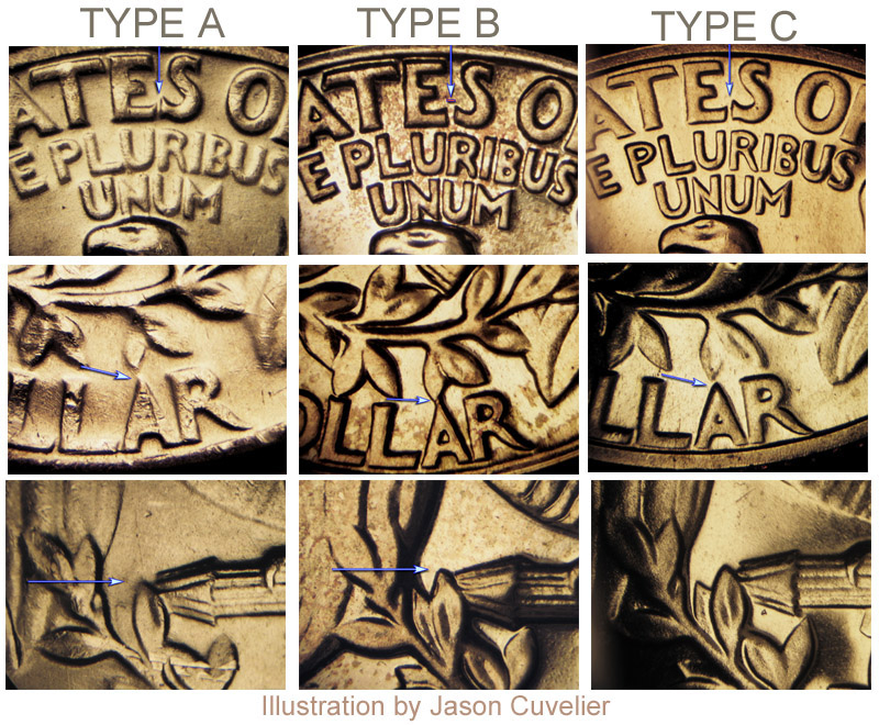 B's are found on 1937 - 1964 proofs and some business strikes from Philadelphia in years 1956 - 1964. The more rare ones are 1956 and 1964, although all are worth quite a bit in MS67. The only type C in the silver series is 1964 from Denver, and is also worth a big chunk. The type C is found starting with all 1965 quarters.