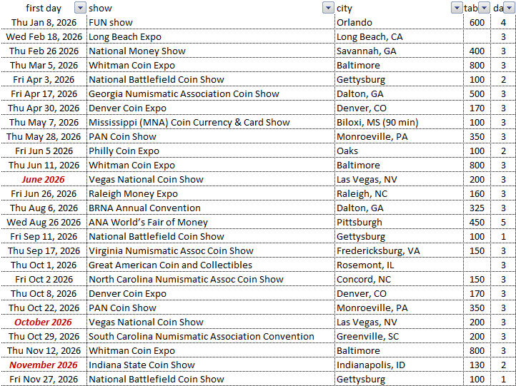 Is there a single website that lists the dates and locations of all the major coin shows (100+ tables) in 2026?