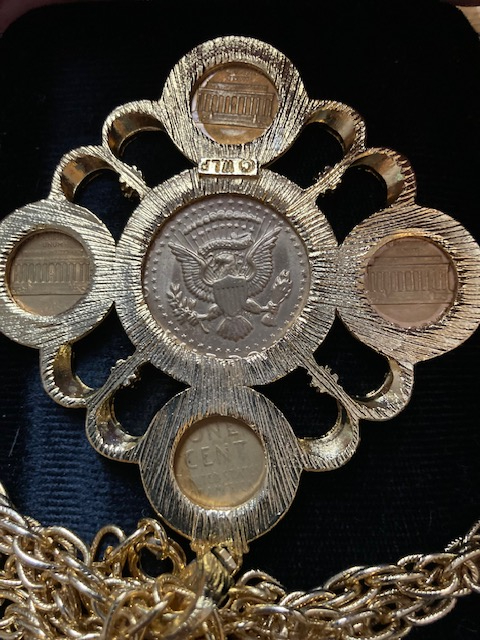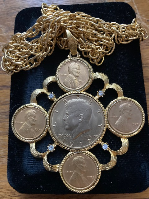The 1970s clad coins aren't worth sending to a TPG for grading. I'd look for a 14k or 18k marking on the chain or bezel for the gold content... that's the only "value" I see here...