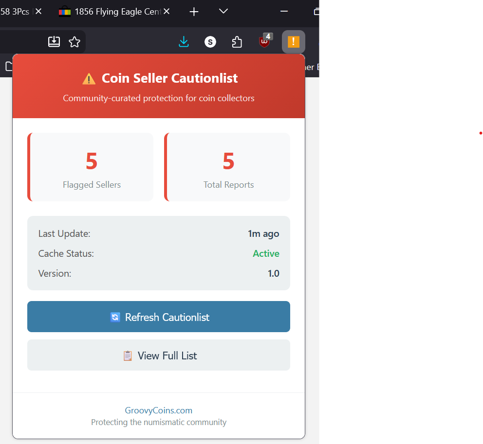 PS. If you have added a listing and it's been approved, and you browse to one of that seller's items in eBay - it may not show FLAGGED until an hour has passed, when it queries the Cautionlist again. You can force the update by clicking on the plugin (which I pinned to my Extensions bar) and hitting Refresh Cautionlist. This is an optional step for impatient folks like me!
