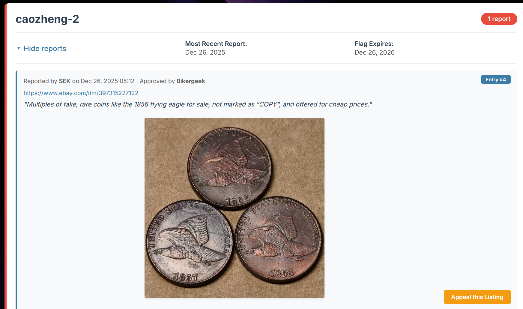 I hate eBay counterfeits. Earlier this year I called the Secret Service and spoke to a sympathetic receptionist - but the agent she said would return my call never did. Reporting the seller in eBay often leads to "we looked and found that listing to be OK." At best, if your reports are heeded, it's a game of whack-a-mole.