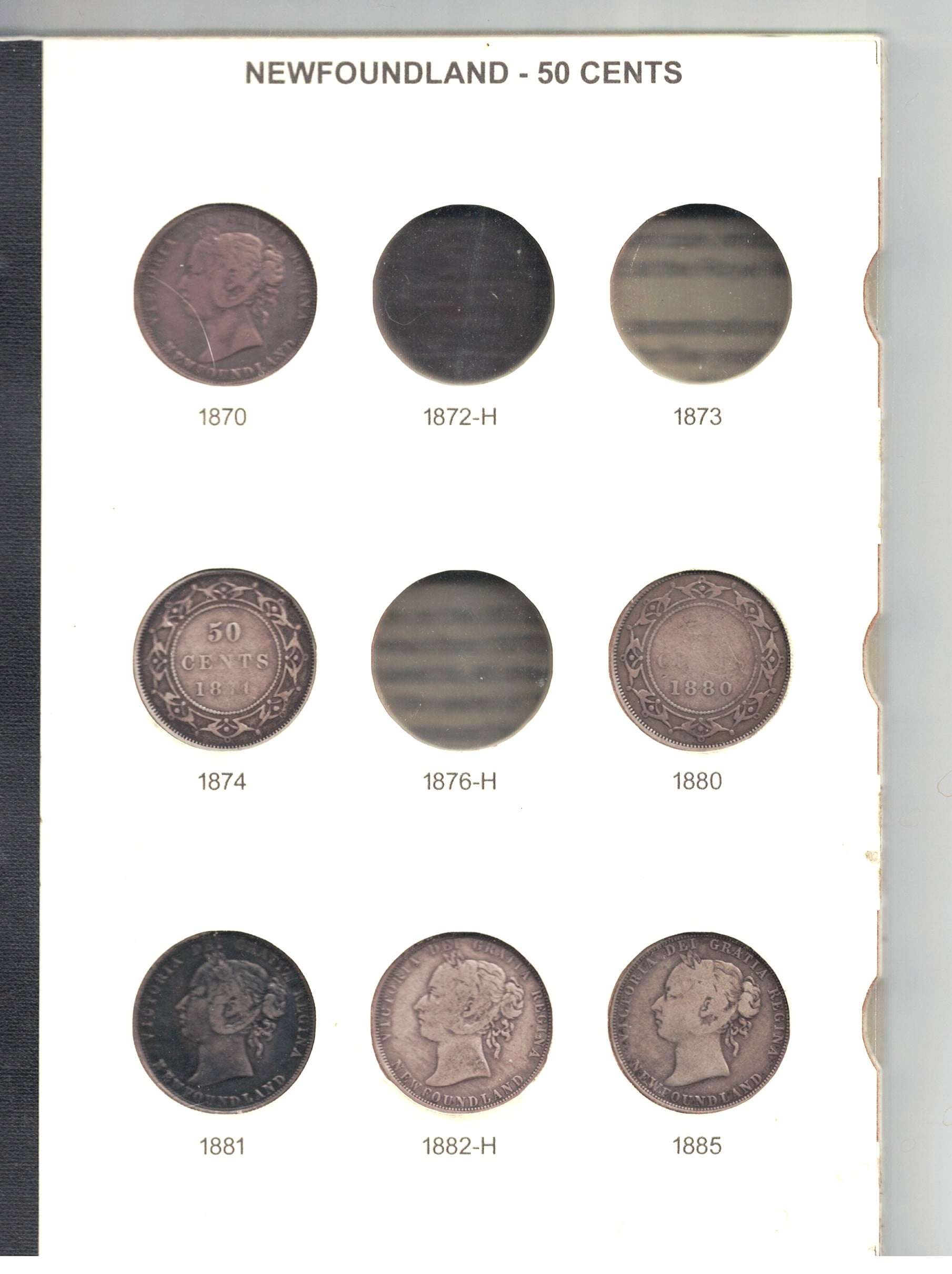 Finally, a nice album for Newfoundland halves. Thanks @The_Dinosaur_Man for making this excellent album for Newfy halves. This is the first page. The scan has been lightened to show the coins better. The page color is a yellow-cream color normally, but here the scan has been lightened to show the coins better. My coins fit well in the holes and the slides are fine. Cat hair is not included. Both obverses and reverses are shown because I was deciding which should be shown on the front of the album page. I'll probably post the reverse on the front.