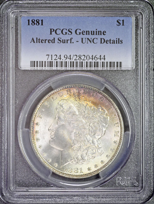 As you can see from the post above by @Barberian PCGS has downgraded at least those two previously ANACS graded coins. Is it your stance that those two are outliers and no other coin previously graded at ANACS has or will ever be downgraded by another TPG? In that case this may be of interest to you, this 1881 Morgan was previously straight graded by ANACS in one of the first gen lamp gold foil reverse small white holders. I sure wish now that I had not cracked and submitted it but if you believe strongly that ANACS grading is on par with PCGS which opinion do you agree with? The straight grade at ANACS or the alt surface from PCGS.