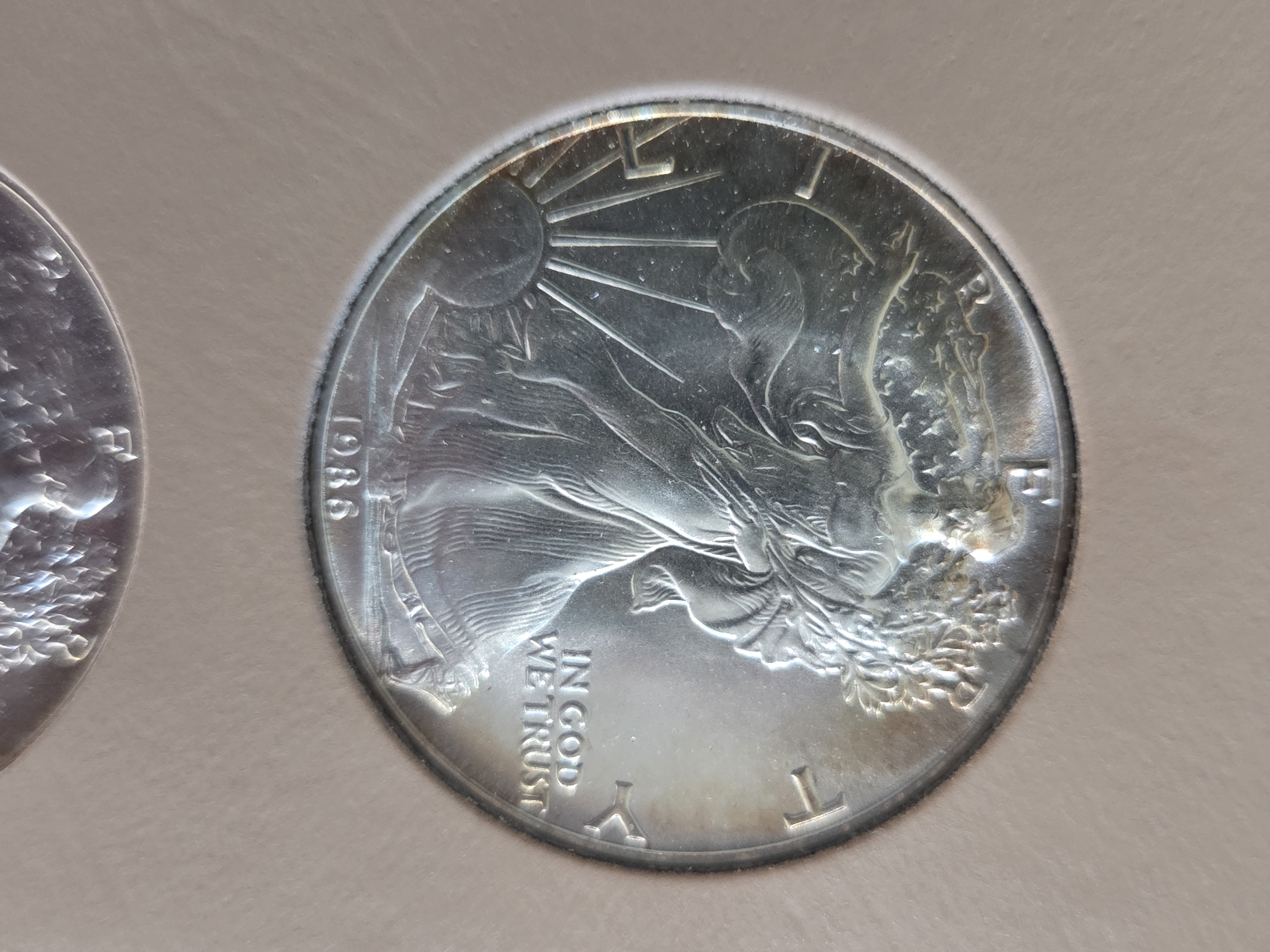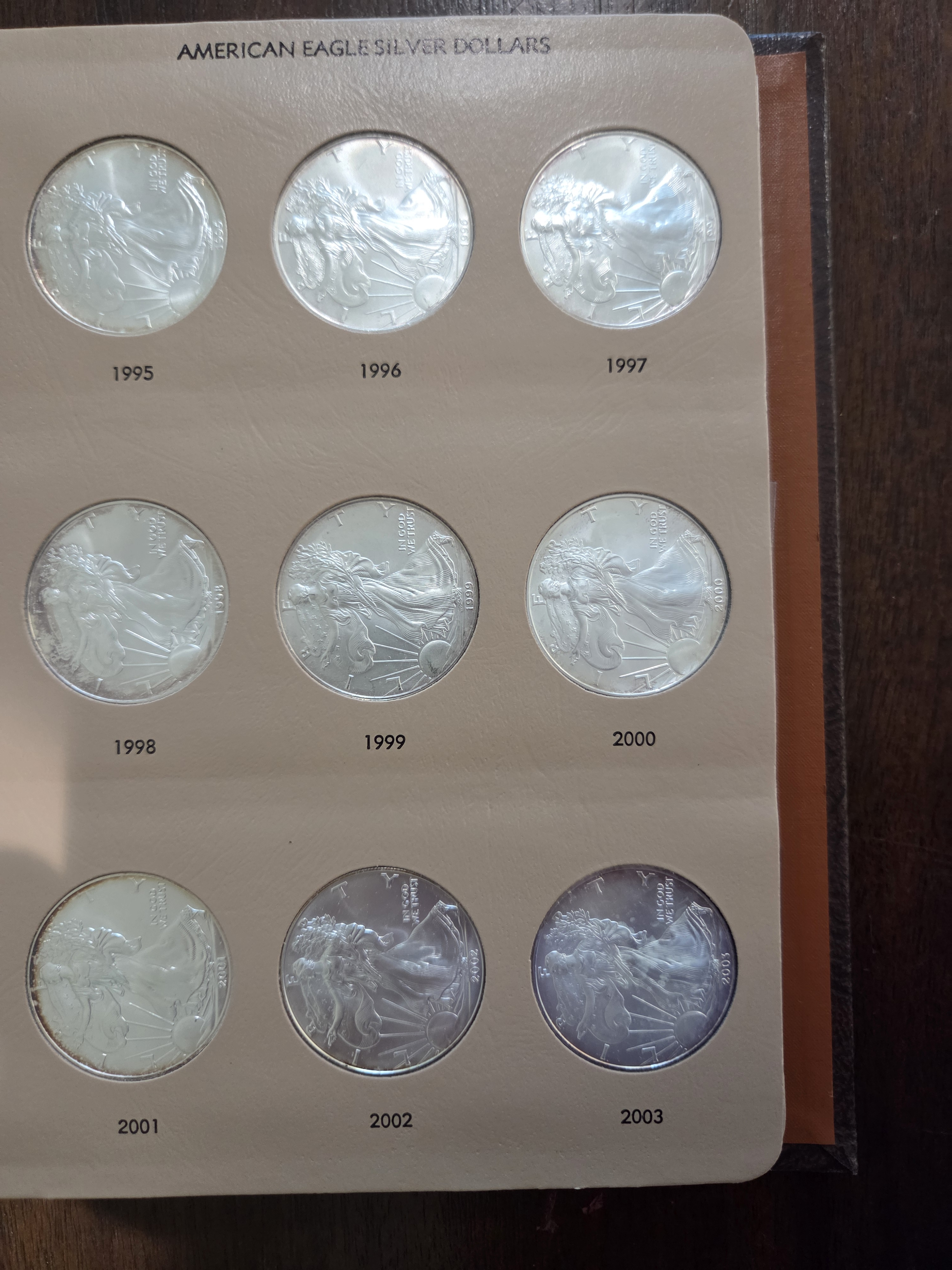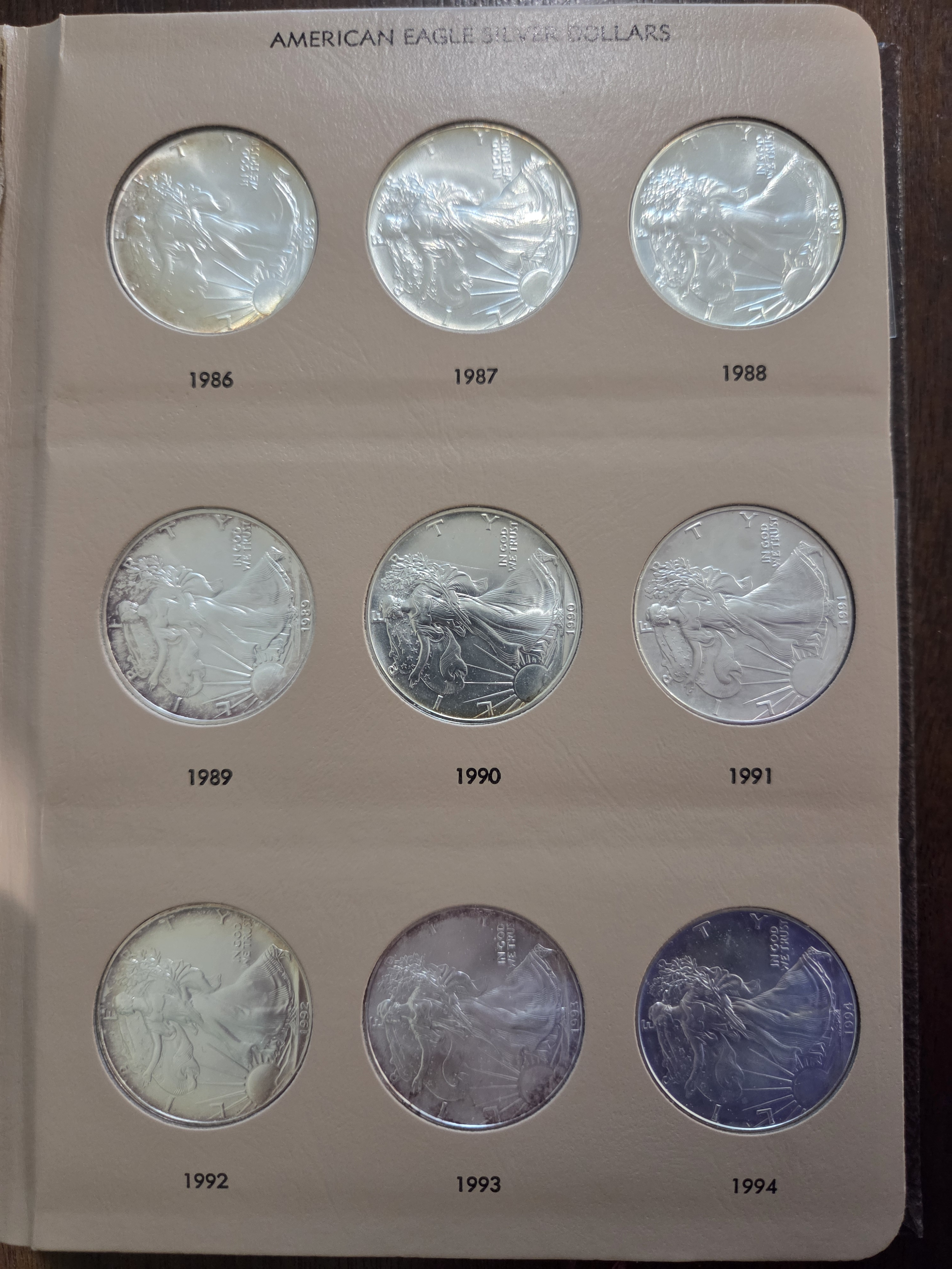 For your consideration, I have a Dansco set of 1 oz American Silver Eagles, from 1986-2020. The set is housed in a fairly nice albumn, but it does have a number on the binder (not sure if that will come off). The set does have some toning (please see pictures). But also, I think any and all the toning will magically disappear with a bit of dip, so while the photos don't look great, I think the coins themselves are fine.