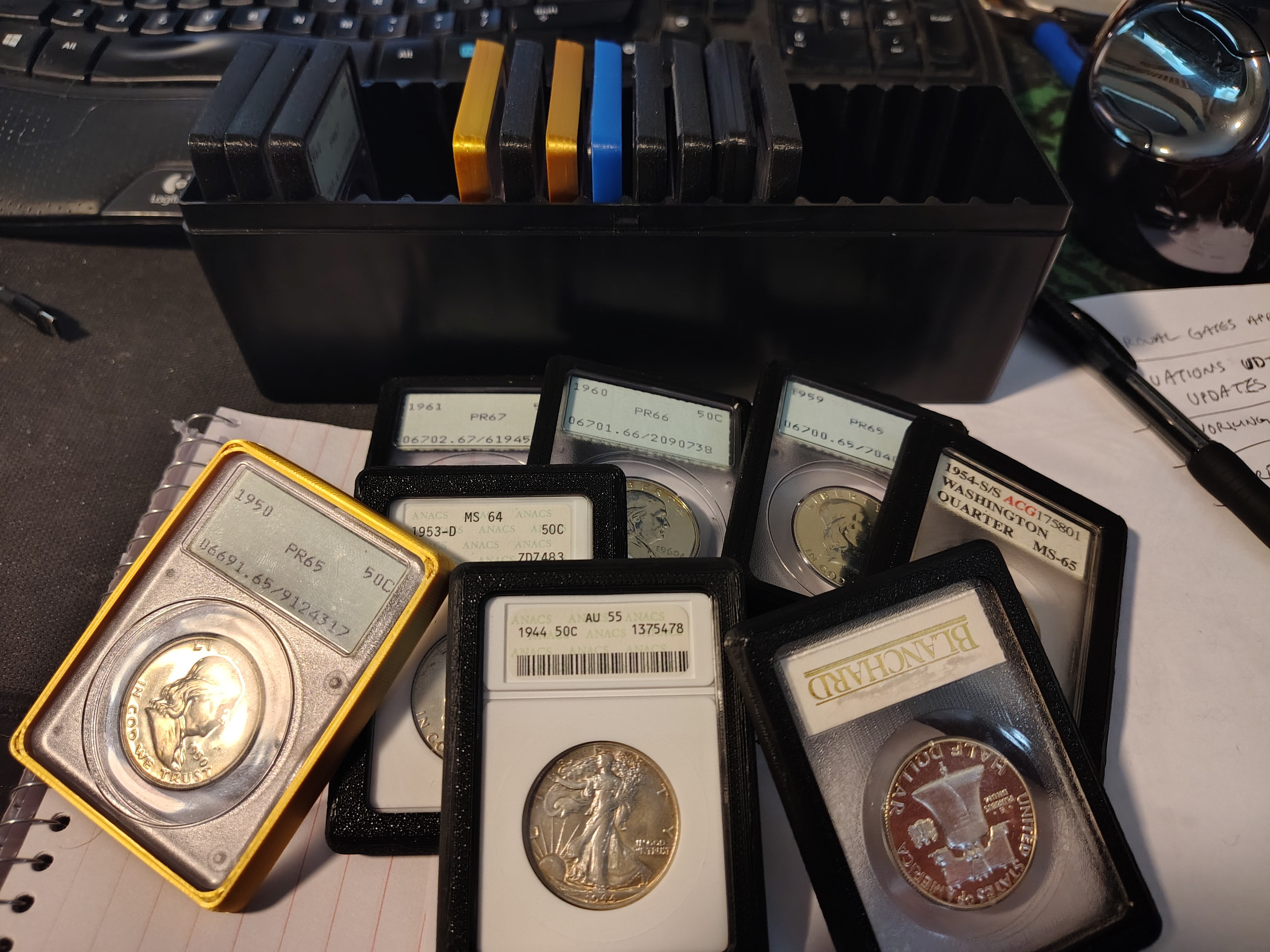 Also, PCGS had a short, cardboard box once upon a time. I find it a very convenient size to carry with me to shows and there's usually someone offering to buy it from me, which tells me that either they would also like something that size or they collect PCGS artifacts. That would be cool, sized to accommodate NGC and CACG.