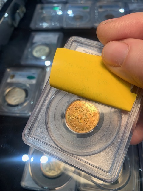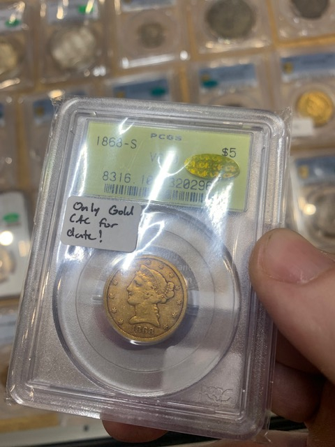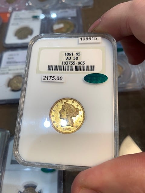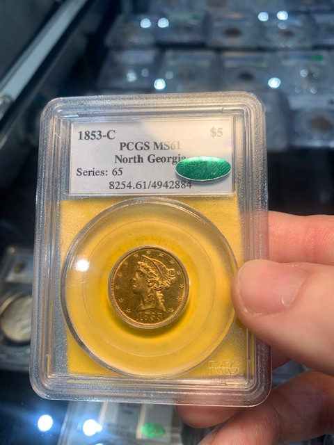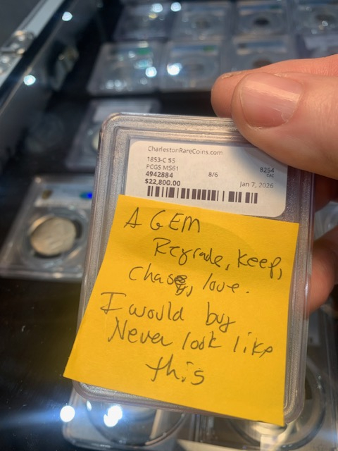 -I viewed an interesting 1853-C $5 in a dealer case. It had a note on it (I guessed JA at CAC, but later disproved that after checking against handwriting of notes I have from him at home). It was a nice example. When asking for the net price there was a bit of a panic where the dealer stated the note should not have been on it and that coin was supposed to be sent for regrade and was missed. After passing through several hands and discussion, ultimately the coin wasn't for sale. Regrade or not, it was priced two grades higher, so I didn't understand....oh well.