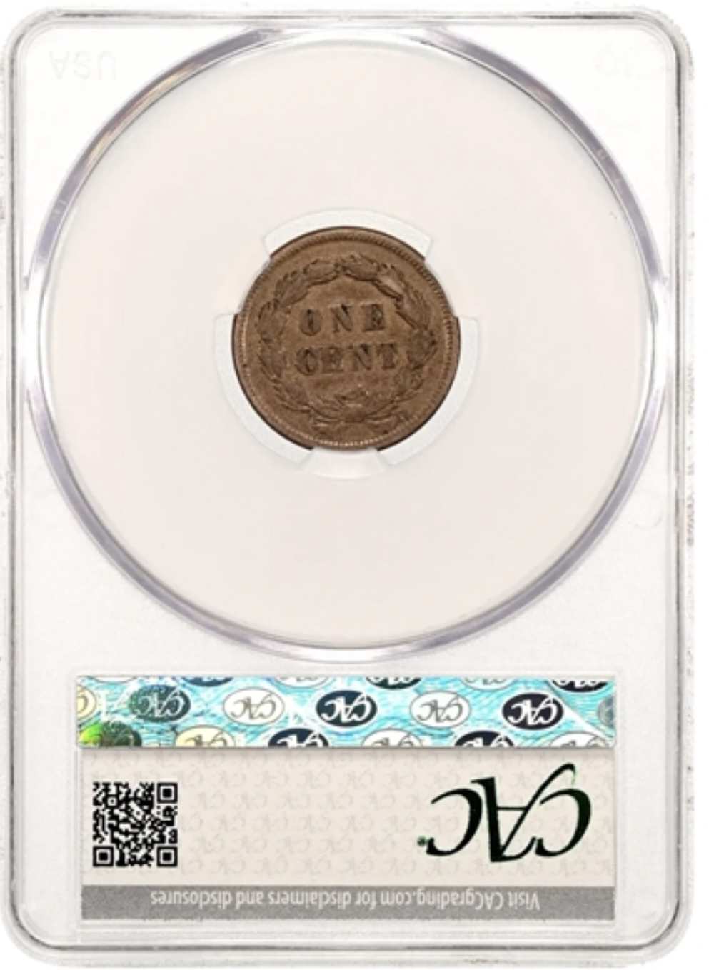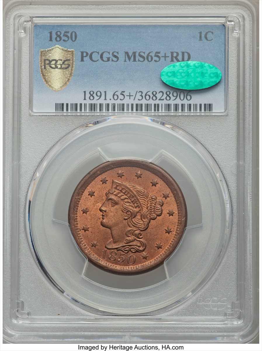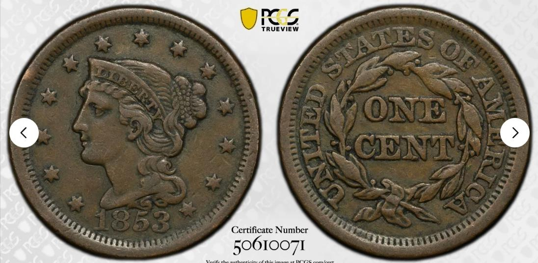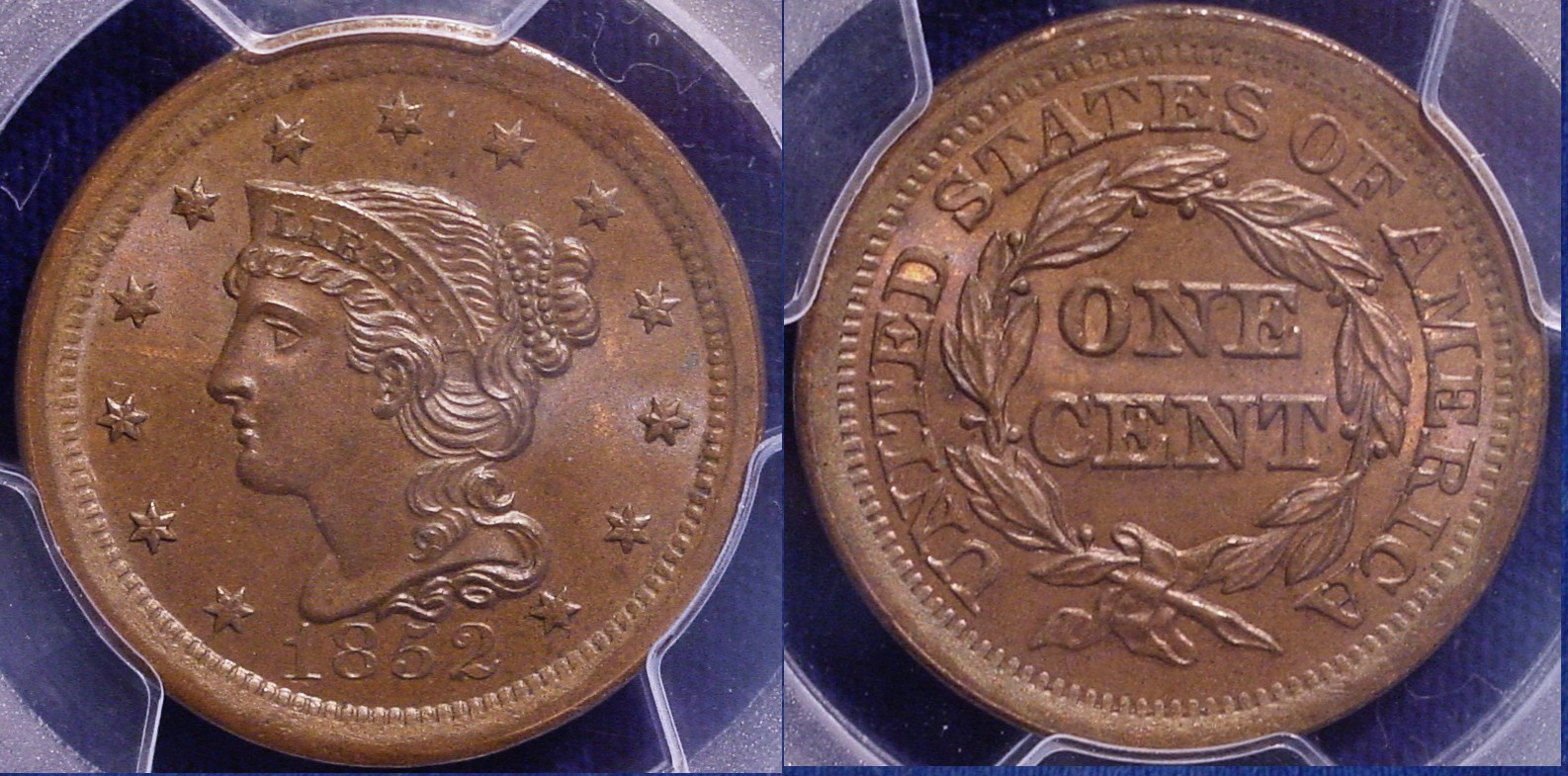 This 1852 large cent is marked with a sticker which notes its exceptionally sharp strike. I really like the coin for that reason. This is graded MS-65, Brown.