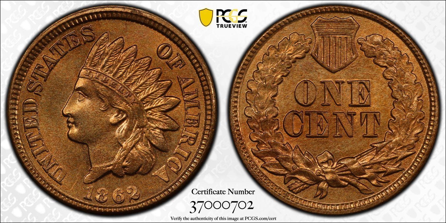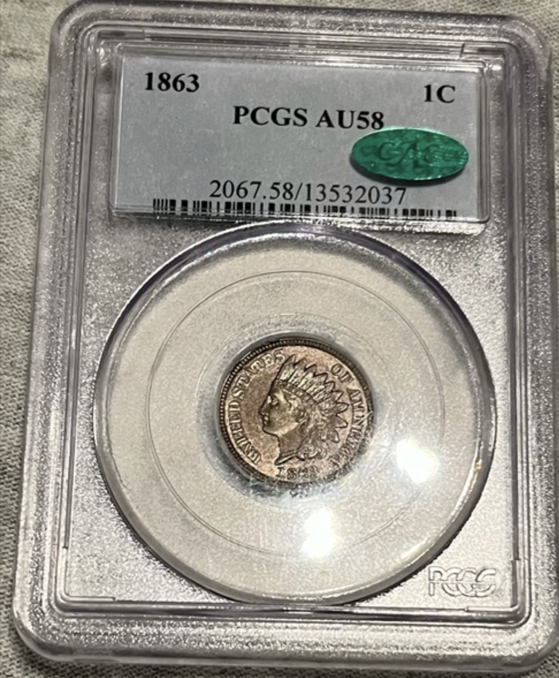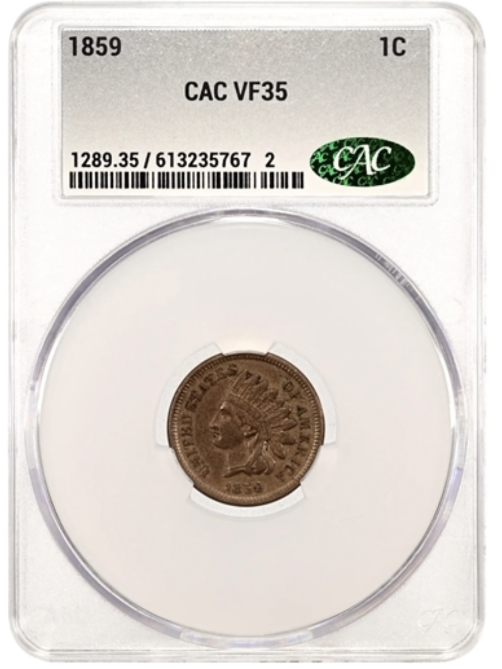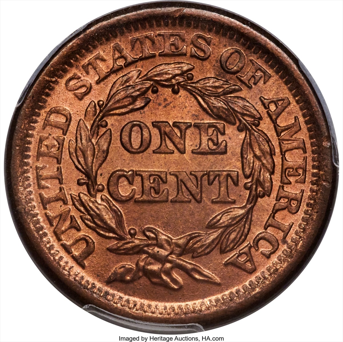 This 1852 large cent is marked with a sticker which notes its exceptionally sharp strike. I really like the coin for that reason. This is graded MS-65, Brown.