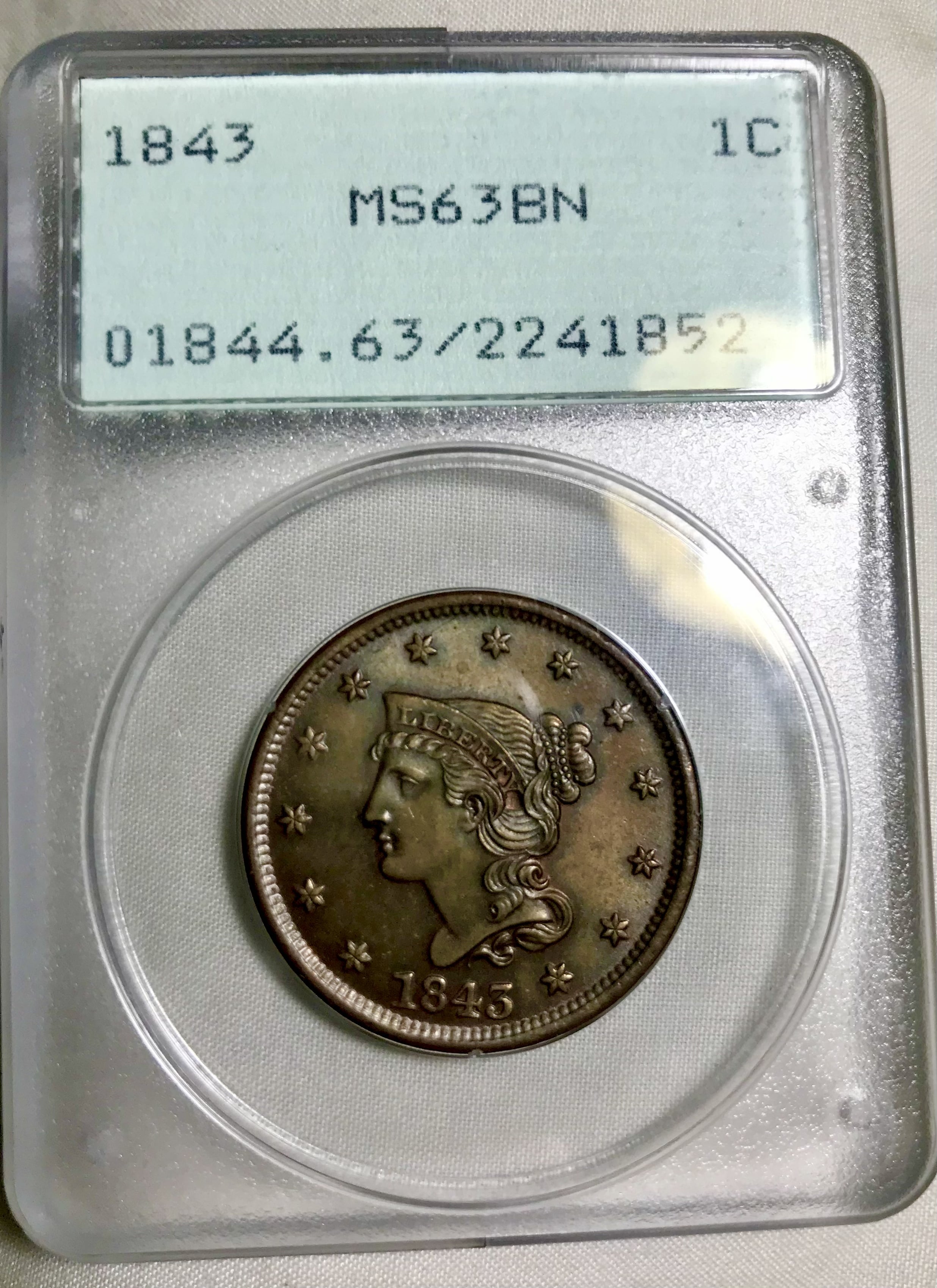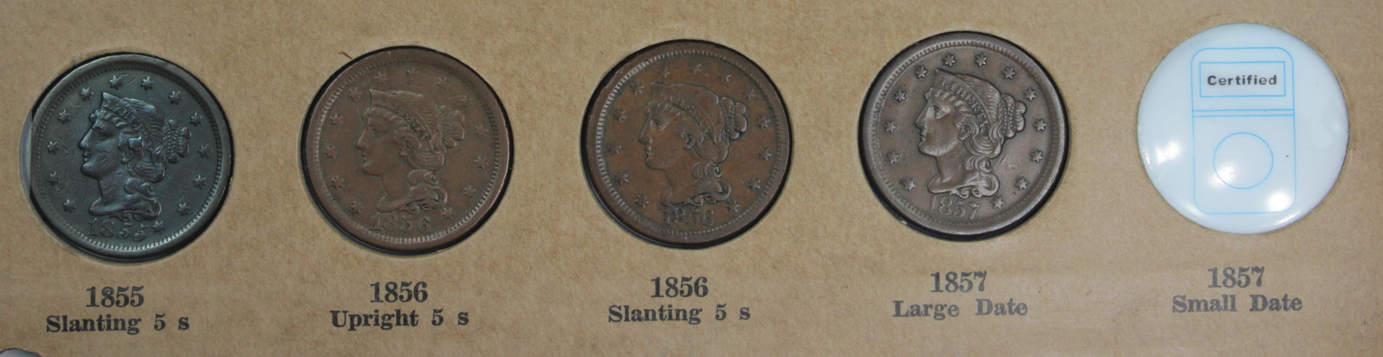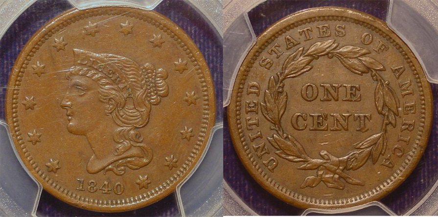 The 1840 large cent with the oddly placed date, as Gobrecht did it, is interesting. This is PCGS graded AU-53.