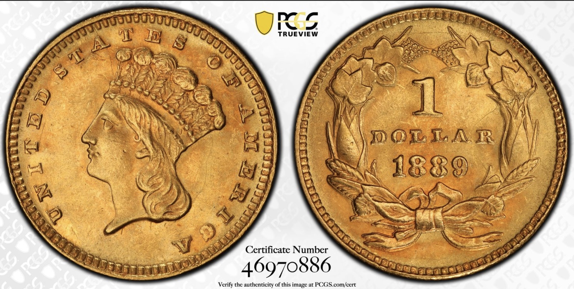 The 1889 gold dollar has a mintage of 28,950. That sounds low until you consider that it was the highest mintage for a gold dollar since 1874. The coin is fairly common with a high percentage of survivors.