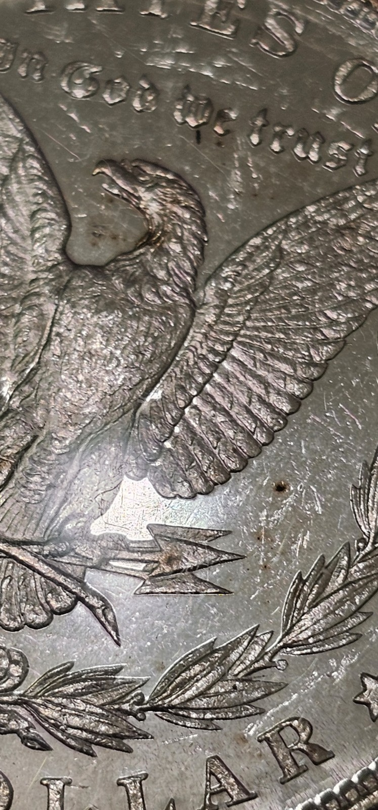 I'm looking at buying this Morgan, it has these spots on it. I know carbon spots can't be removed. I'm thinking these are not carbon-related. And when I say "carbon spots" I don't know if carbon spot is the correct description, you know what I mean. It kind of looks to me like surface gunk that could possible be removed with restoration. What is everyone's opinion? This is the only picture I have.