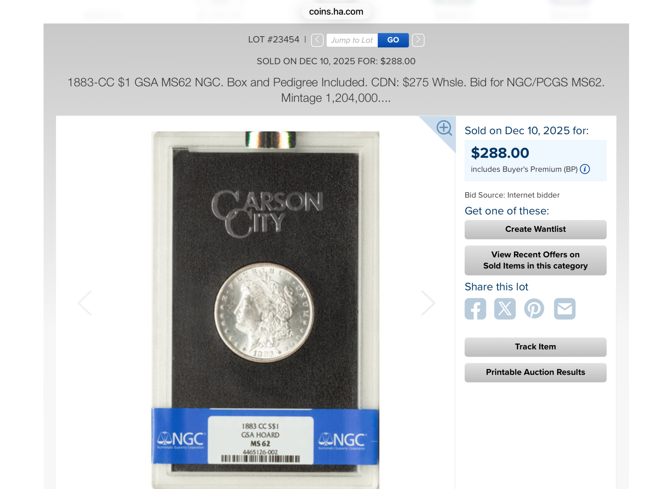 Here’s an NGC MS62, (in the GSA holder) which brought $288 last month:
