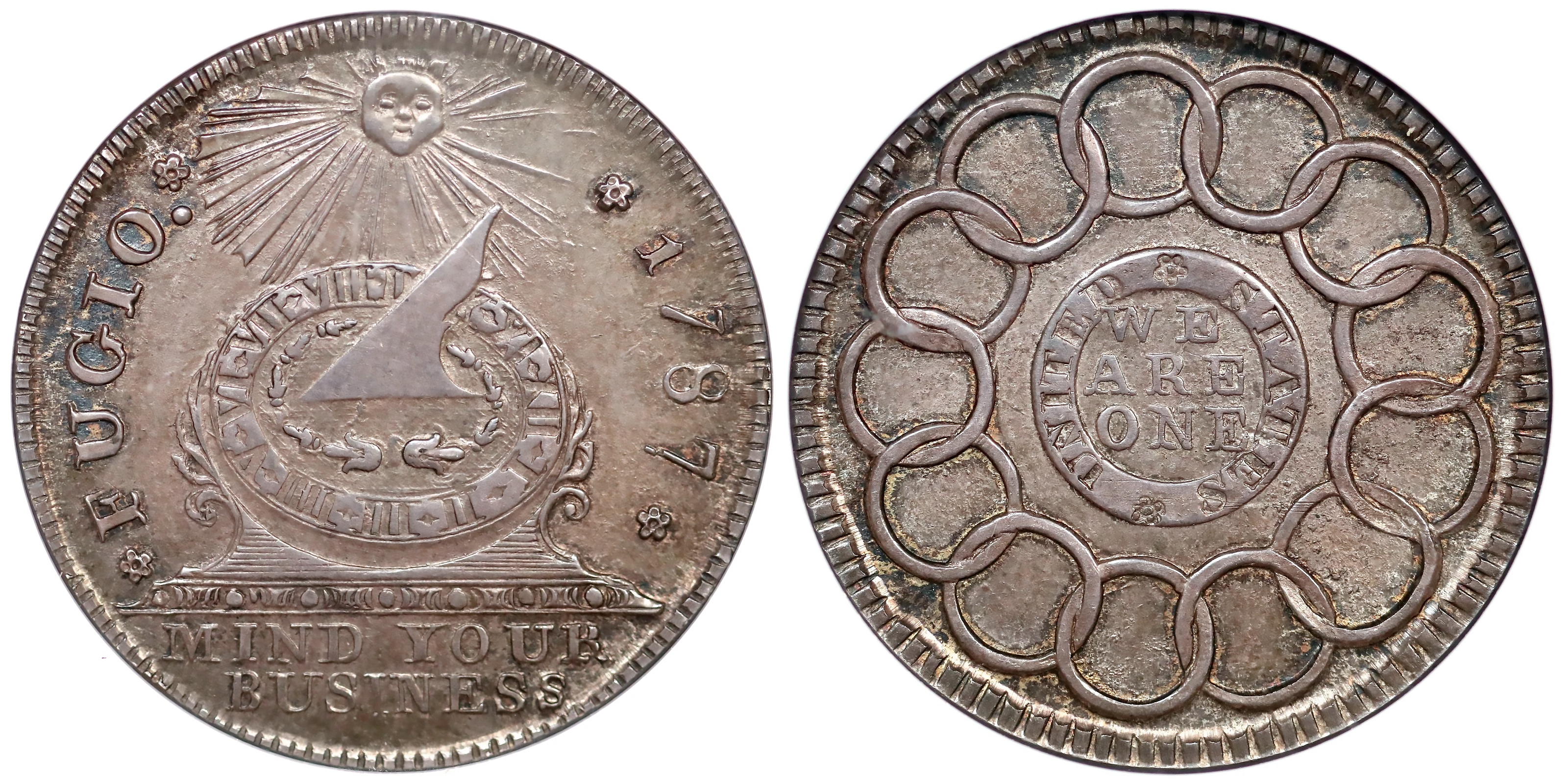 My first purchase of 2026. An NGC63 Fugio, of course. Well, sort of a Fugio. This is a silver strike of the 104-FF die pair, the most common of the so-called "New Haven Restrikes." As the story goes, in 1859 or 1860 (both dates are used in the story) noted amateur archeologist, Horatio Rust, was travelling in the New Haven, CT area when a local coin collector lead him to the JE Bassett hardware store which had the residue of James Jarvis' mint which struck CTs and Fugios. Rust said he saw old Fugio dies lying in the open, some being used as paperweights. Rust purchased the dies and had several hundred copper, 50 silver, and one gold piece struck at an unnamed local factory. He also sold one die pair (105-QQ) to NY coin dealer John Curtis, who had 12 silver pieces struck before the obverse die fractured.