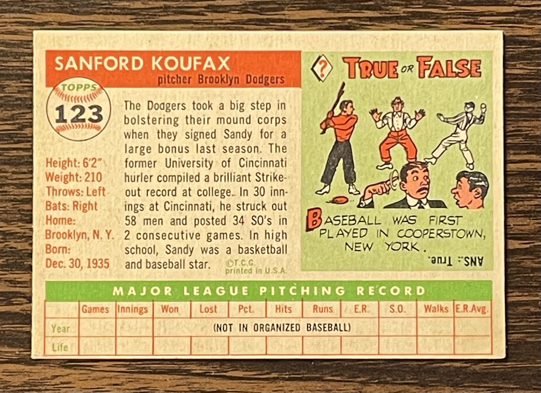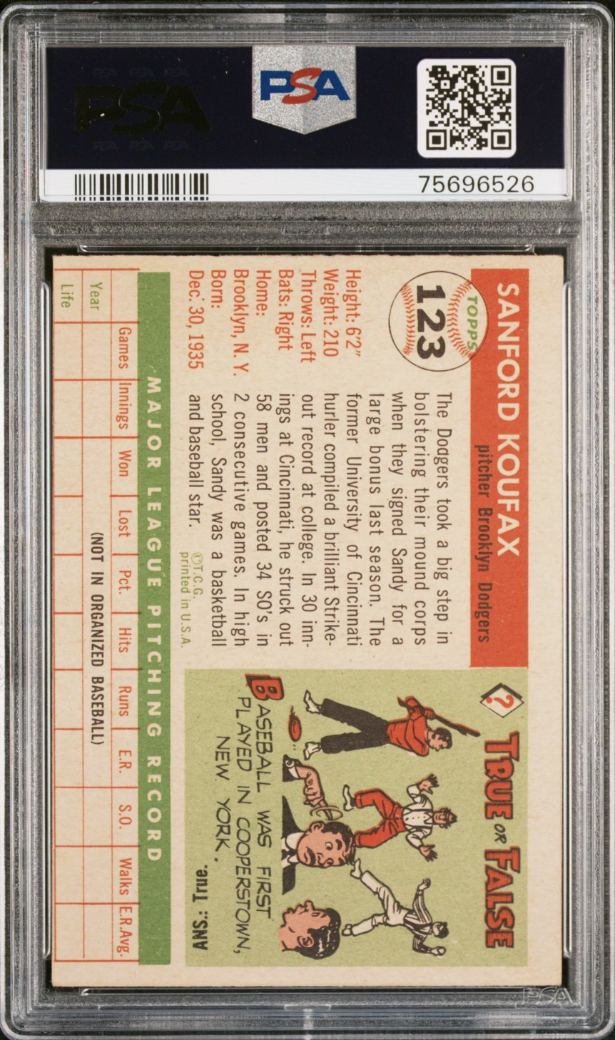 I'm surprised it did not get a MC designation. It looks to be missing a little bit of the bottom red line on the reverse under the box that says 'life'. Nevertheless, that's a nice Koufax rookie.