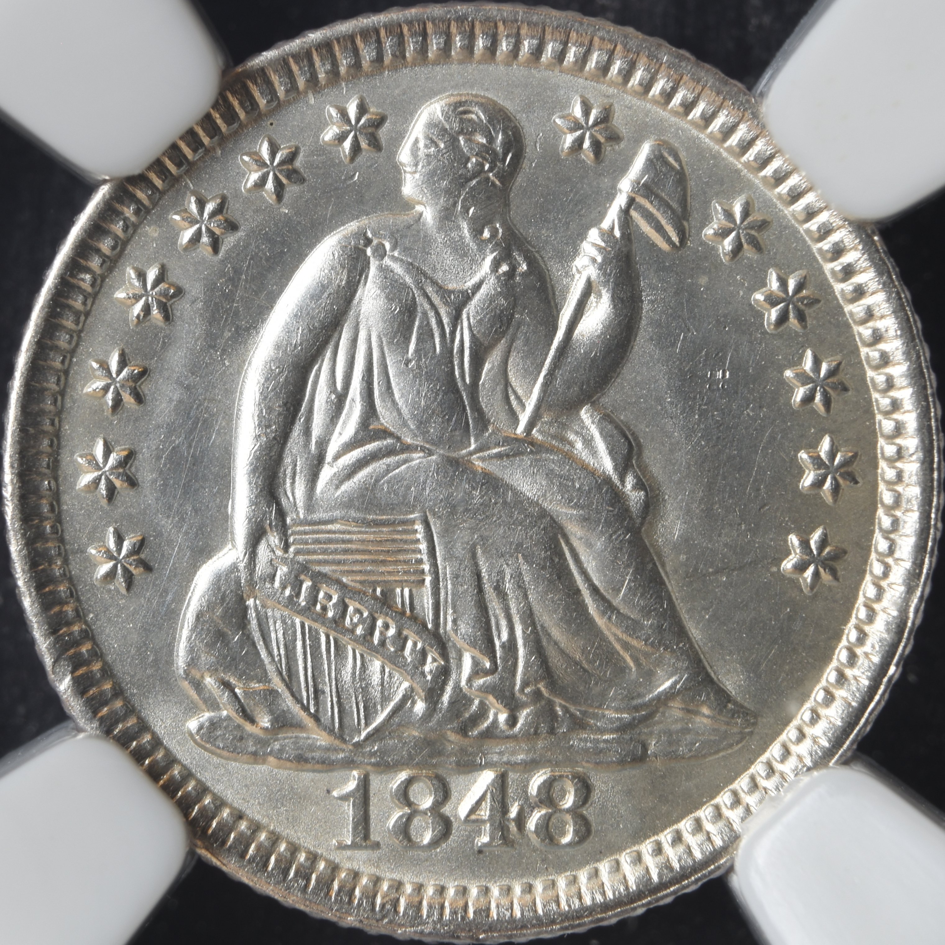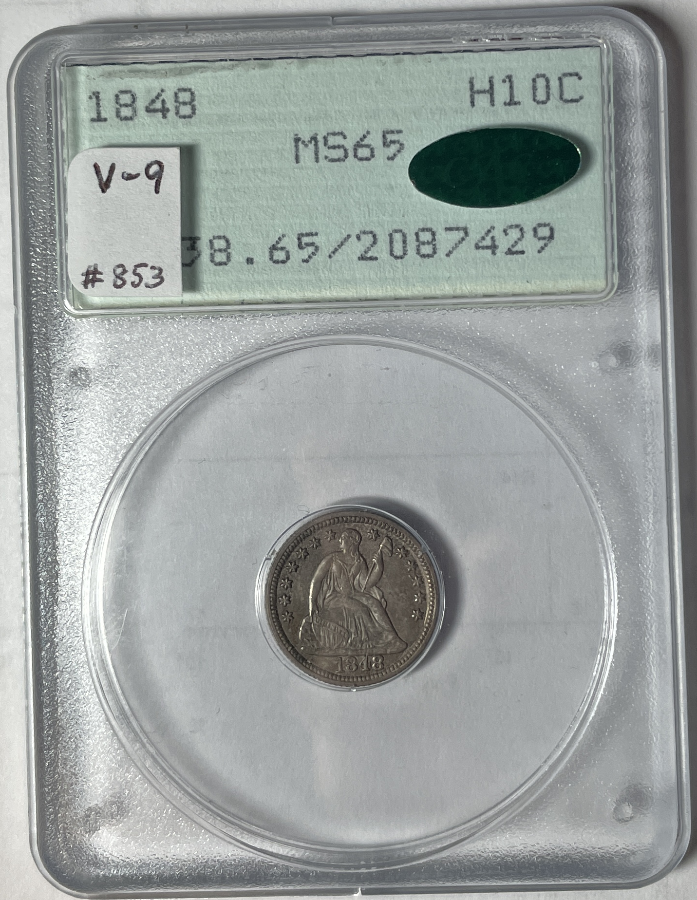 I'm into my 22nd year collecting mainly certified coins. It has taken me that long to purchase a coin in a PCGS rattler holder. It's an 1848 V-9 half dime. The V-9 is a rare die marriage, and is easily identifiable without magnification. The primary naked-eye diagnostic is that the date is placed notably farther to the right than in other obverse dies for the date. Also, there is a reverse die crack from ~K9 all the way across to ~K4. At MS65 plus green bean, this coin is undoubtedly the finest known for the marriage.