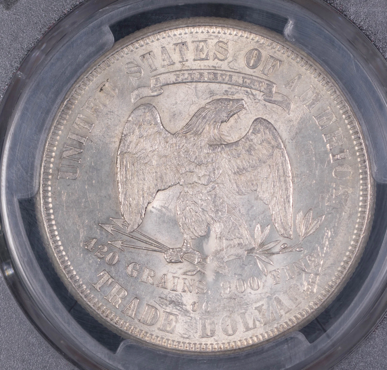 i'm so late to the party the janitor has allready swept up but do you like this coin @lermish ? I have never seen a trade dollar with such a distorted appearance. It does have the virtue of having a great deal of mint luster but the upper front l;eft quarter is almost vacant of detail. I guess I would have guessed MS something but would have to think this strike would count as negative eye appeal. Not trying to diss your coin ; perhaps it fits with your collection in some way. james