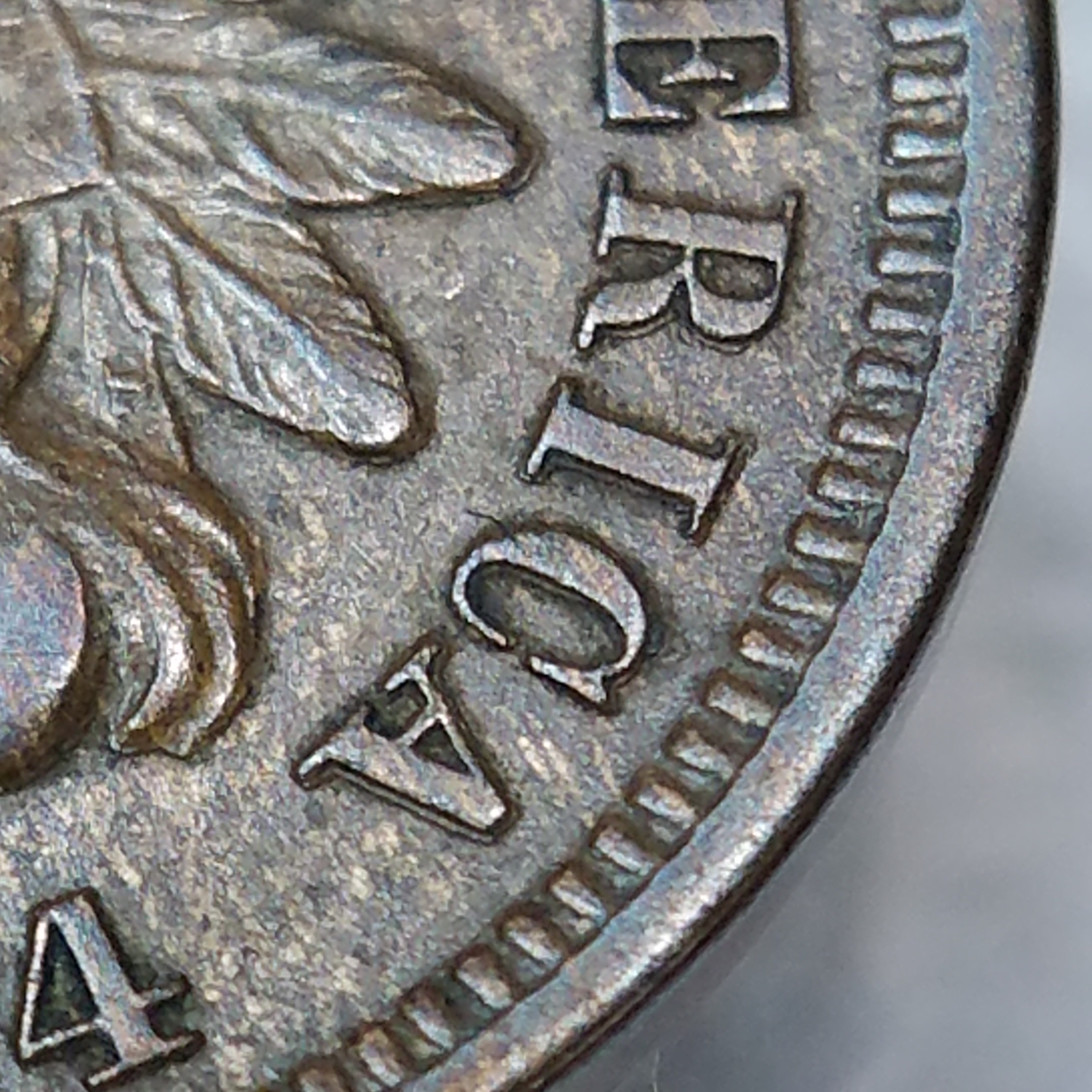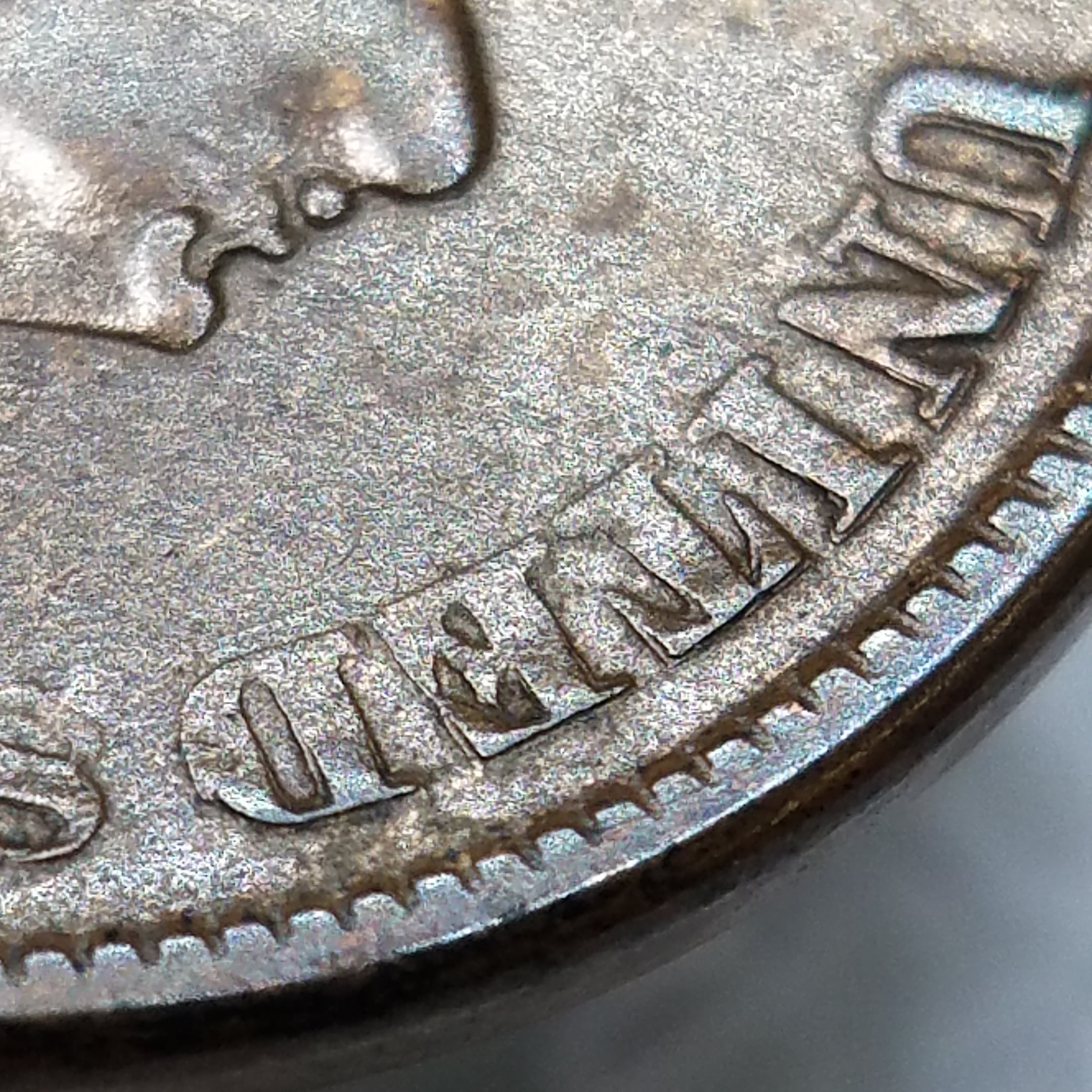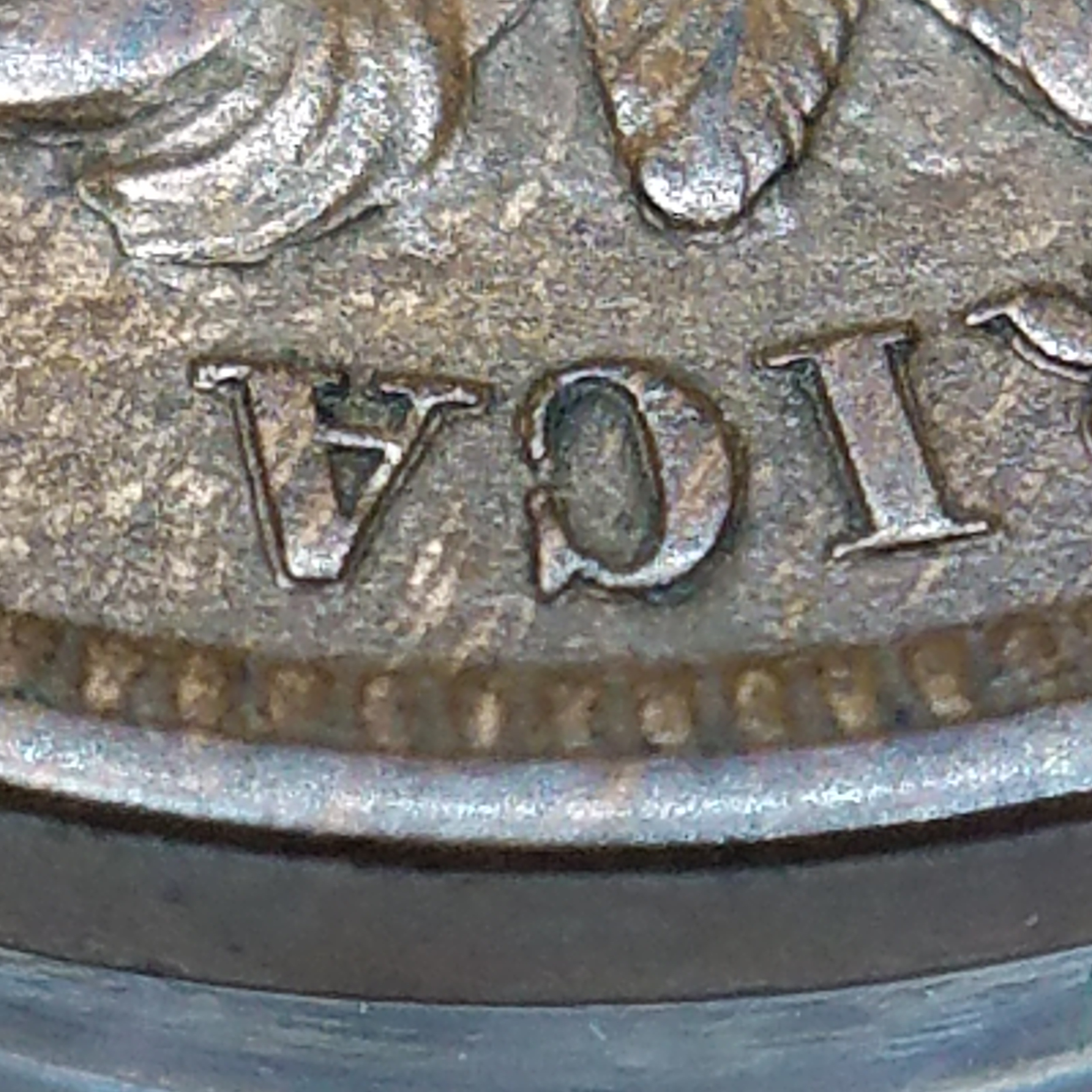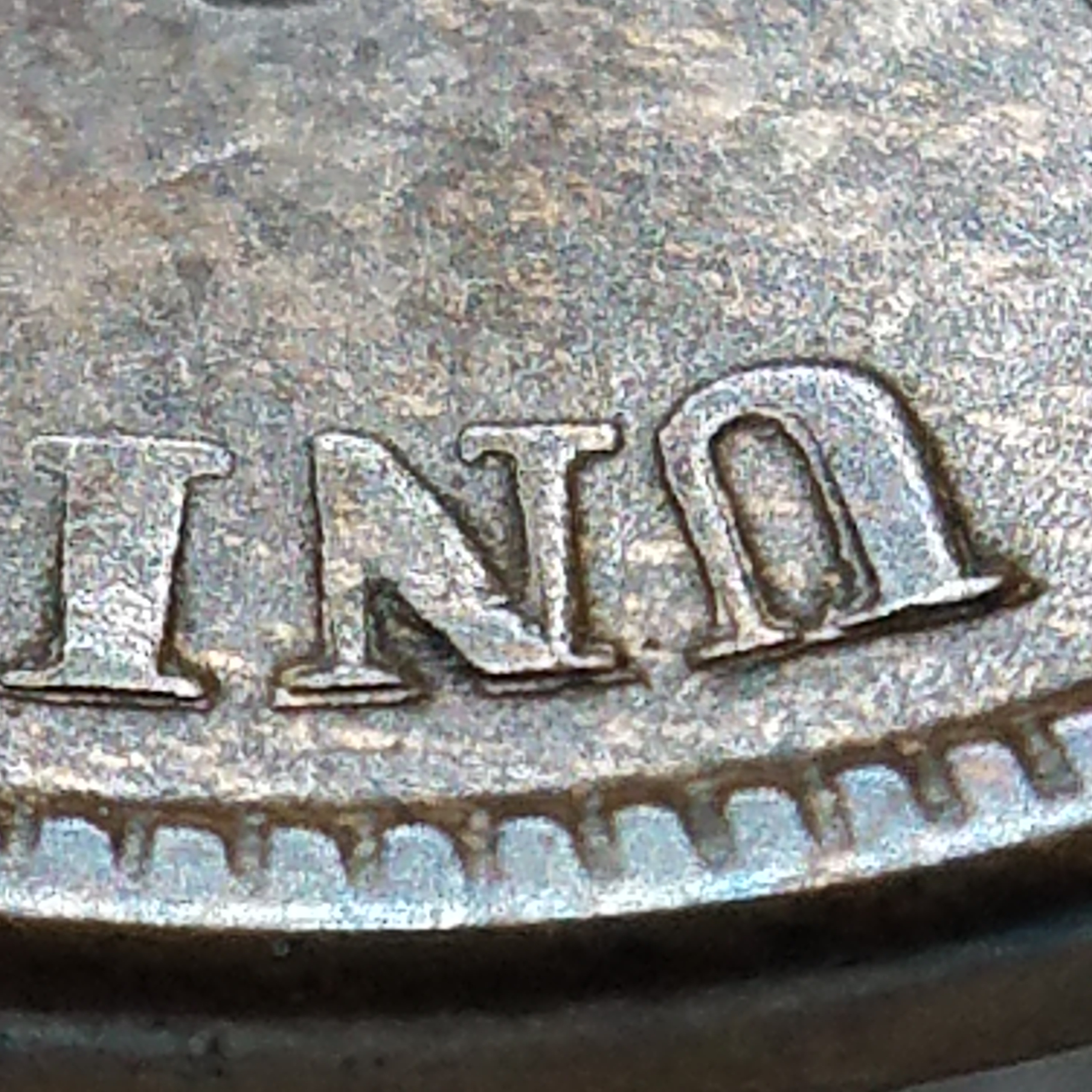 Scroll and first U of UNUM below Bust, most noticeable just above 8 in Date