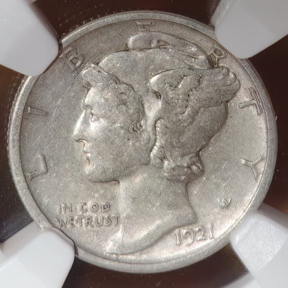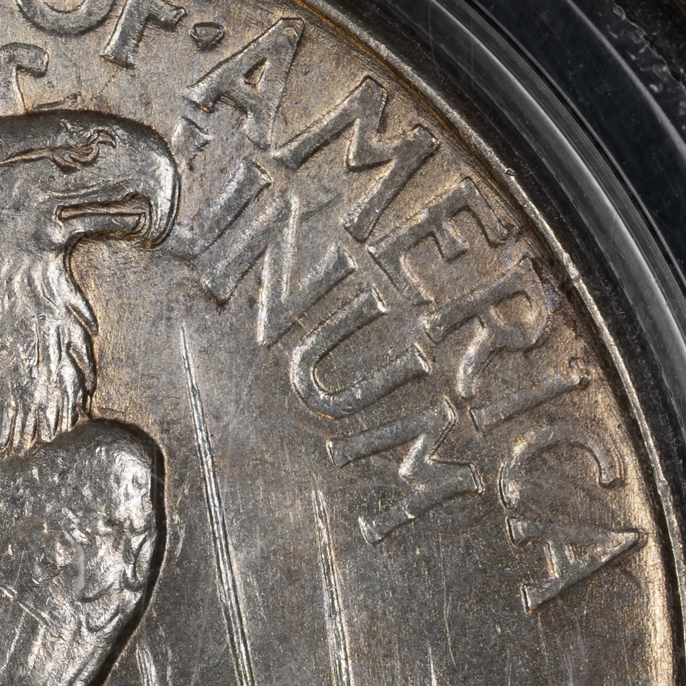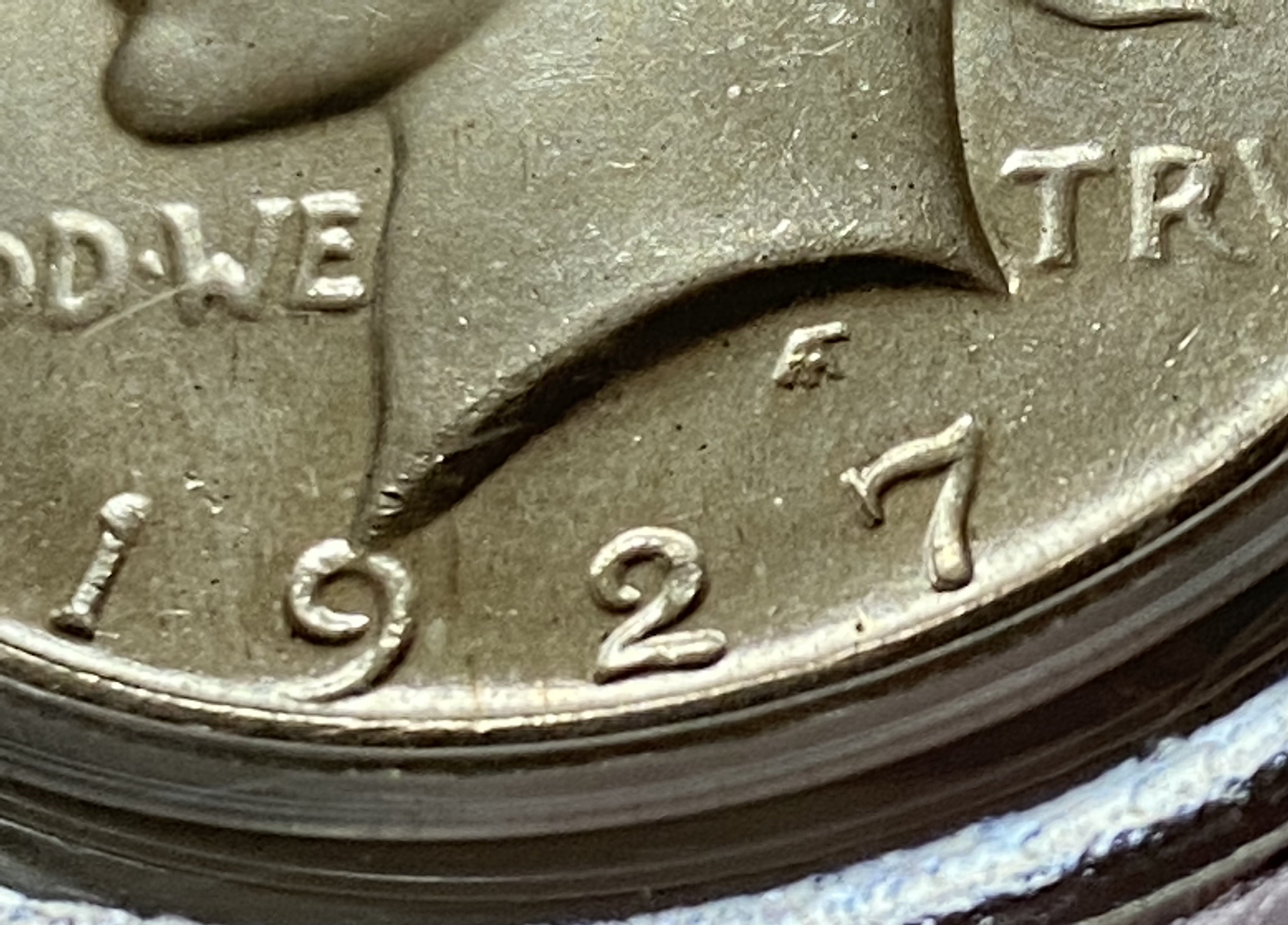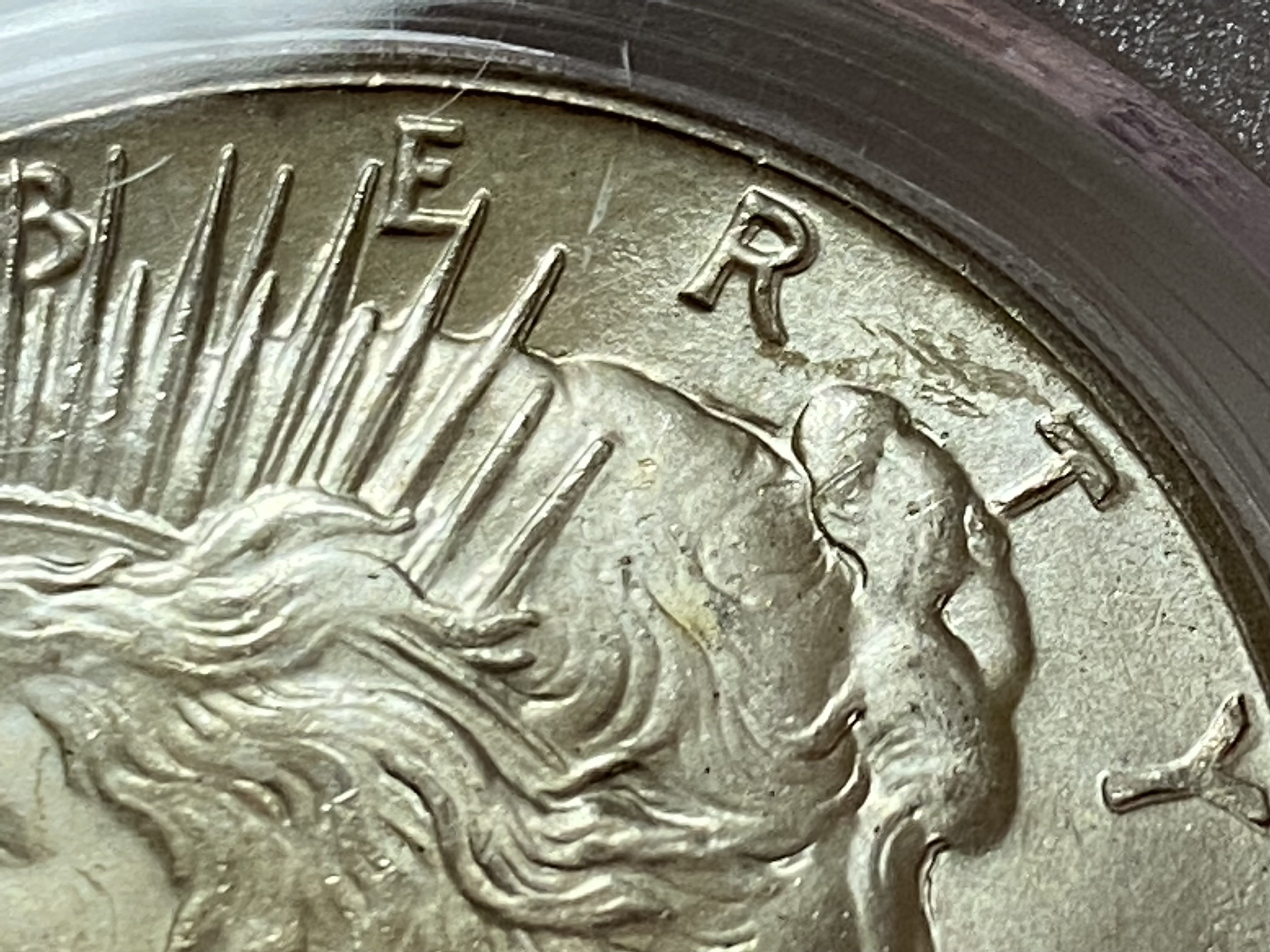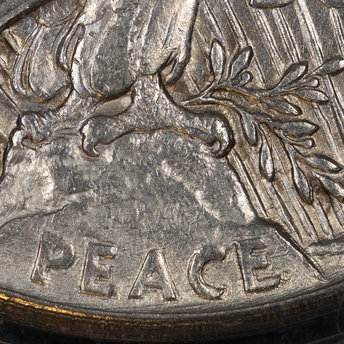 Here’s a fun one. My 1921 Peace dollar with mechanical doubling on the reverse seen in PEACE, a couple of the olive branch leaves, America and Unum, and the eagle’s head.