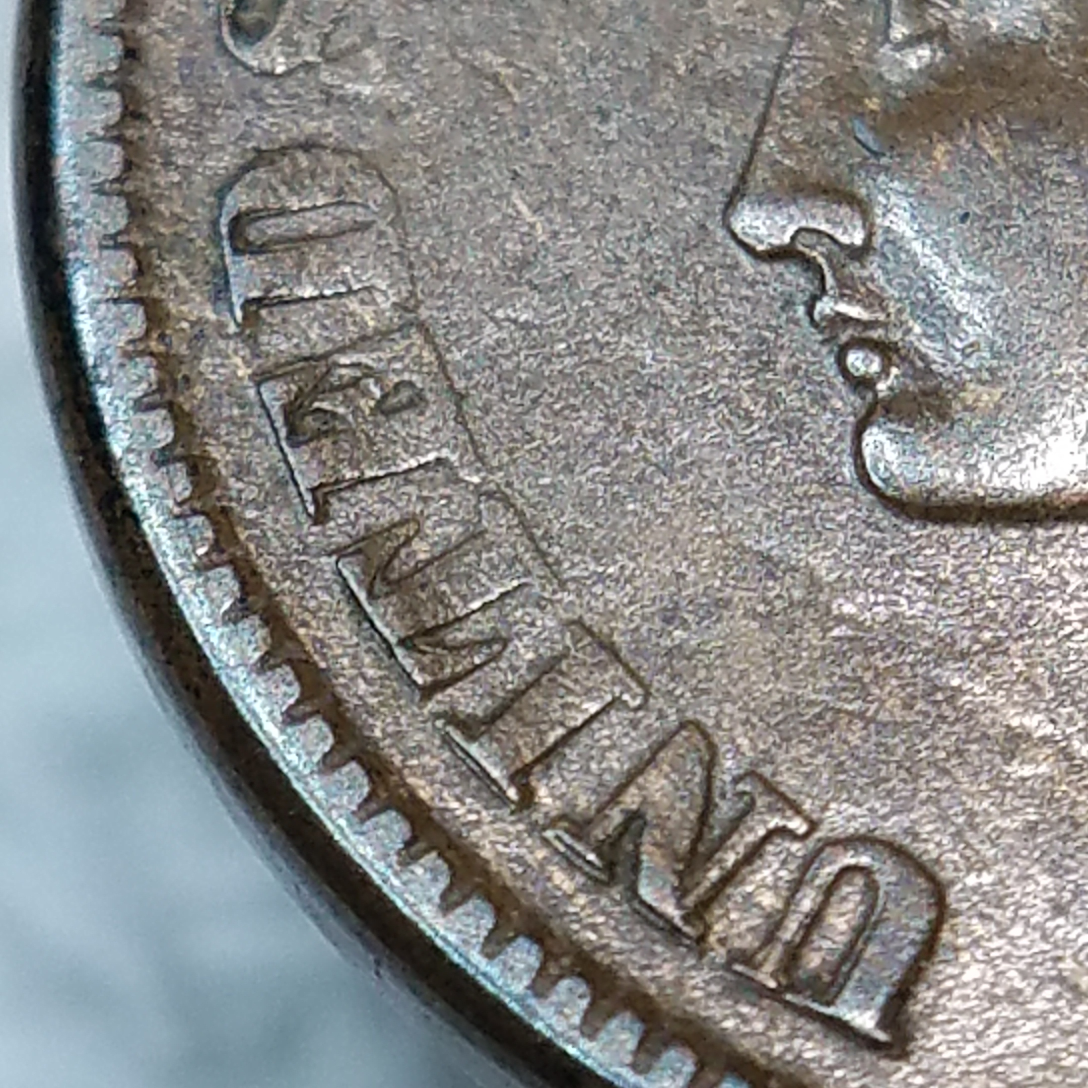 Here are some views of a 1957-D Cent with MD, made more interesting by a large die chip that is also affected by the MD. Note the MM is not affected:
