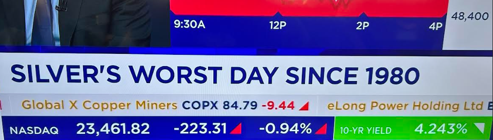 Reminiscent of January 1980. I wouldn't bet on a quick recovery; in fact, I wouldn't be surprised to see silver drop another $30 or more, but my crystal ball is sometimes on the fritz.