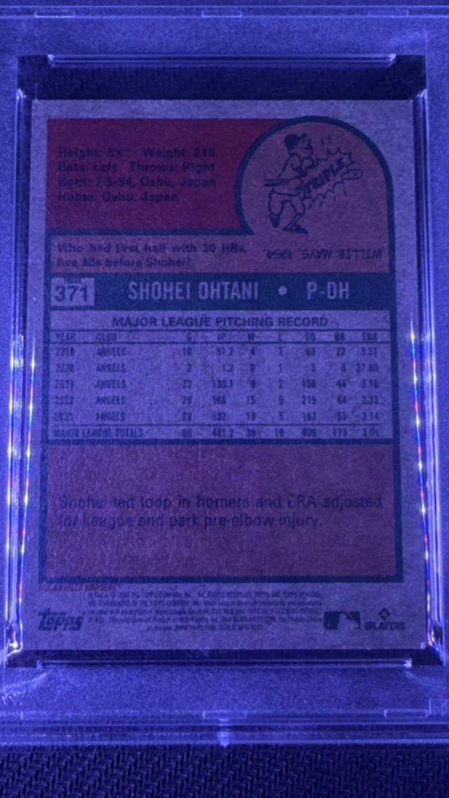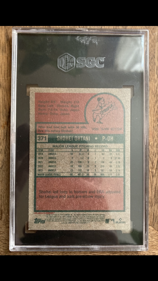 Here is the Ohtani grade, I just don’t understand. The front left to right centering is about the same on every copy I’ve seen, mini or standard, but the folded back corner is glaring. Who do they have grading over there?