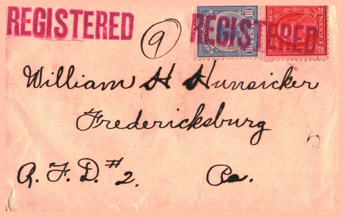 The 10-cent blue registered Mail stamp just has an eagle on it. The red stamp is of George Washington.