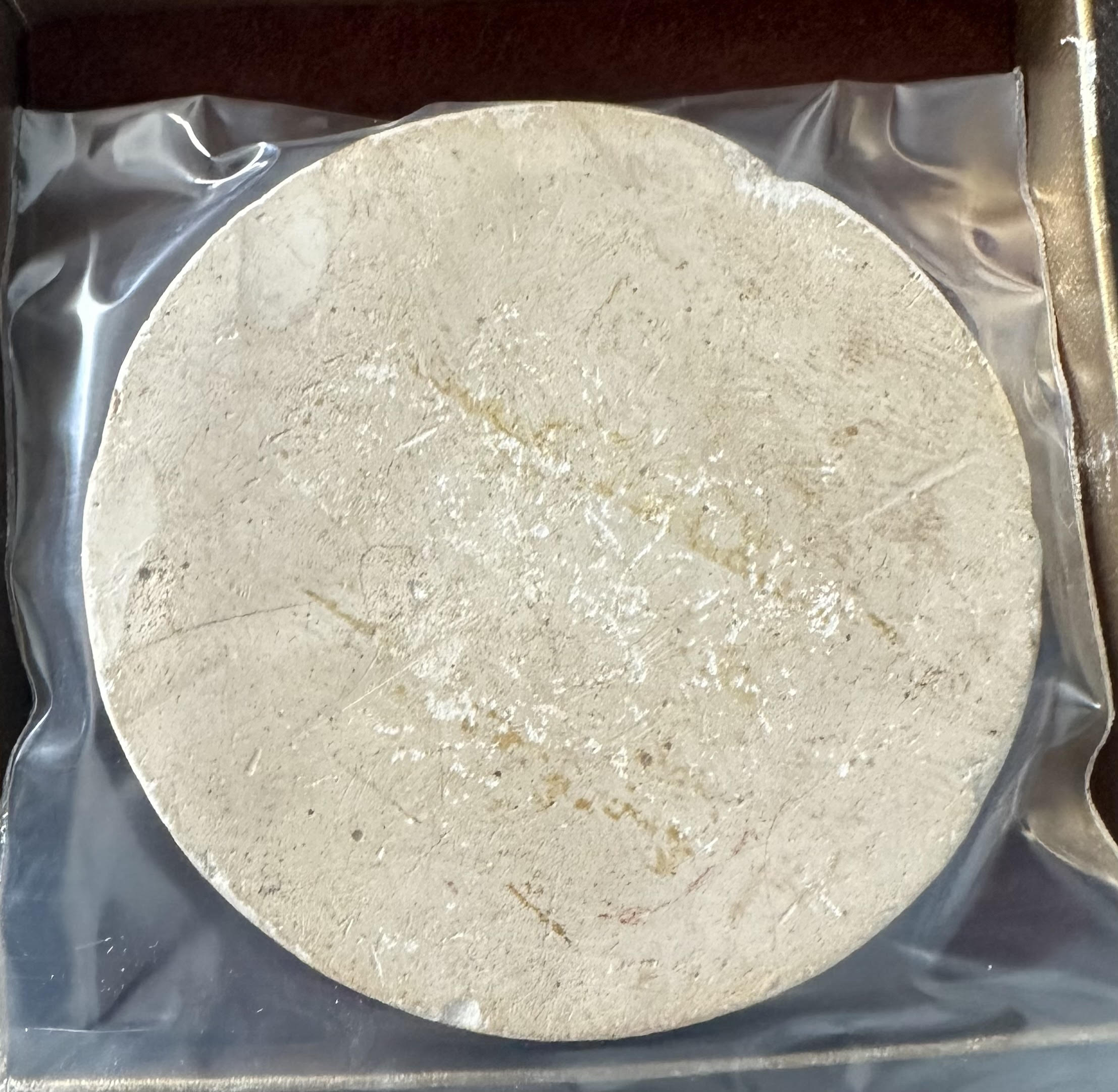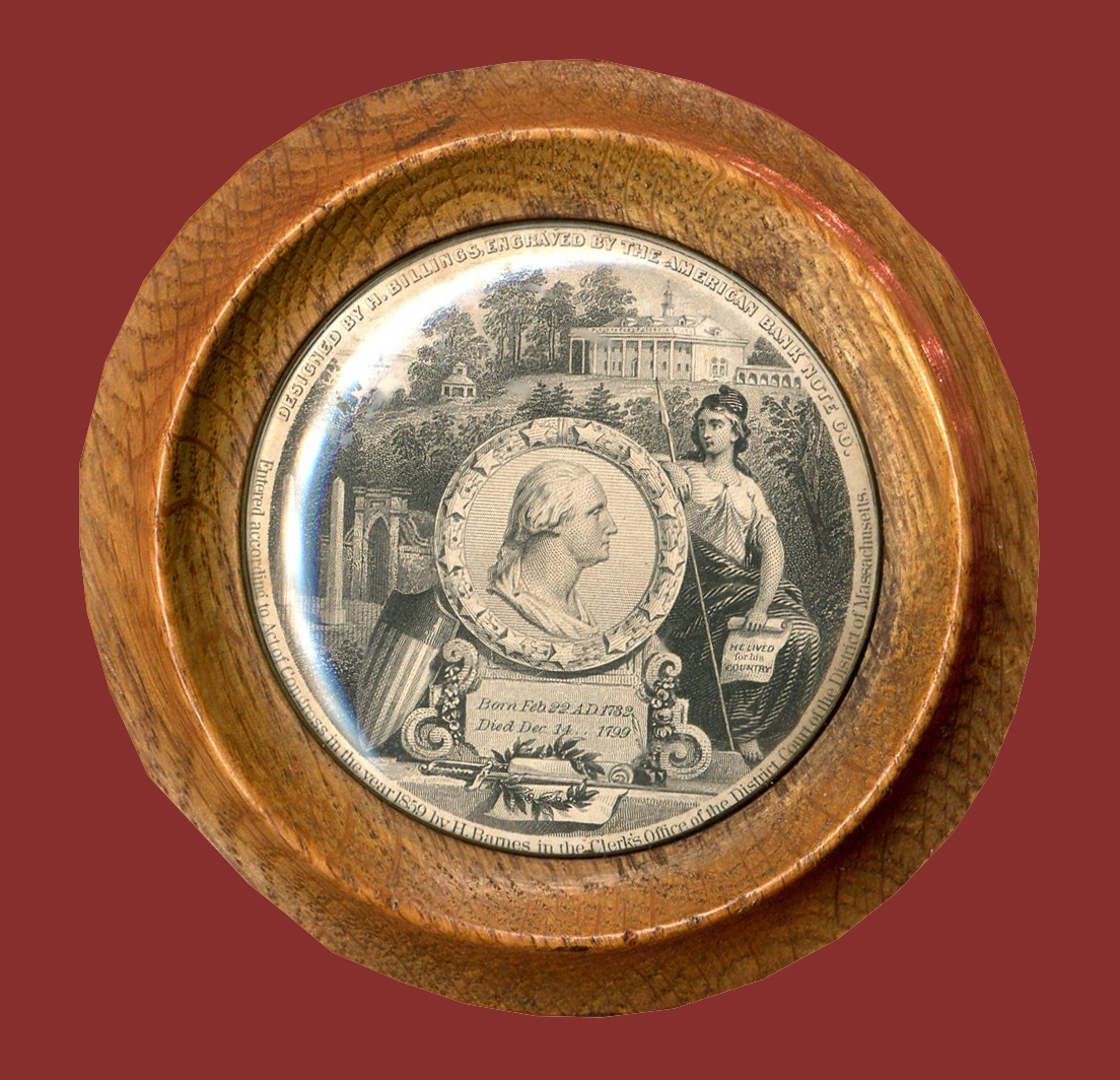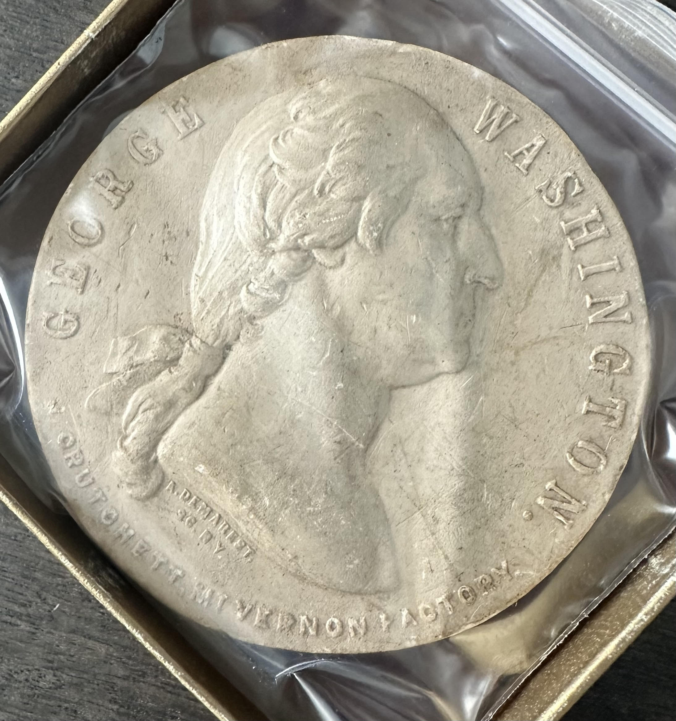 I was wondering if anyone knows anything about this of plaster. Abraham Demarest George Washington Medallion? It is uniface and appears to be made of plaster. On the obverse is George Washington's head looking right with the words George Washington surrounding him. Below his bust is the name A. Damerest SC NY. Below that is says J. Crutchett Mt Vernon Factory. The reverse is blank. I think it might relate to the production process of Demarest's George Washington's Medallions for J. Crutchett around 1859.