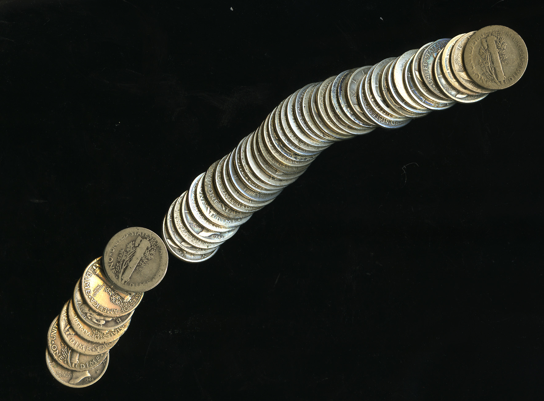 Listing for sale here today 1 roll of 50 90% silver Mercury dimes ($5 face value). Mix of dates from 1916-1945 ranging in condition from cull to moderately circulated (some are cleaned). A wide selection of dates and mintmarks as most of these were pulled from an album.
