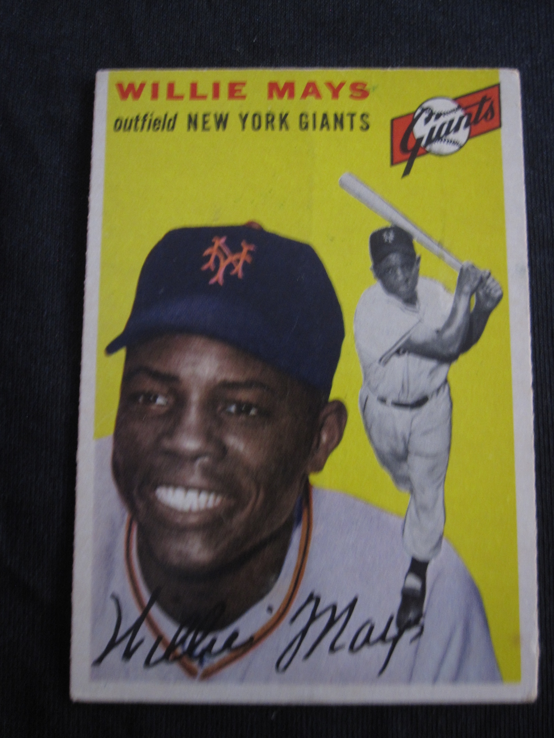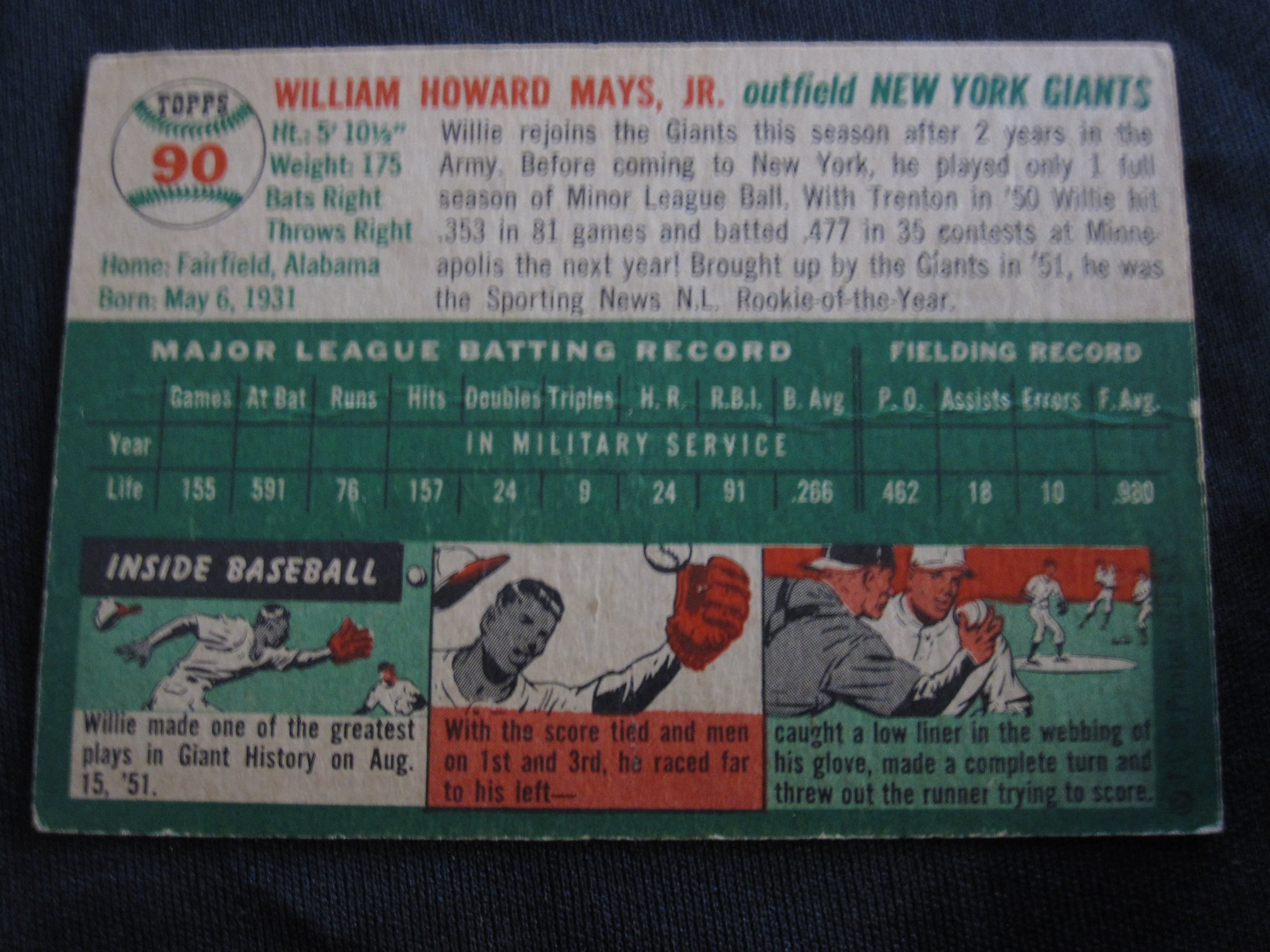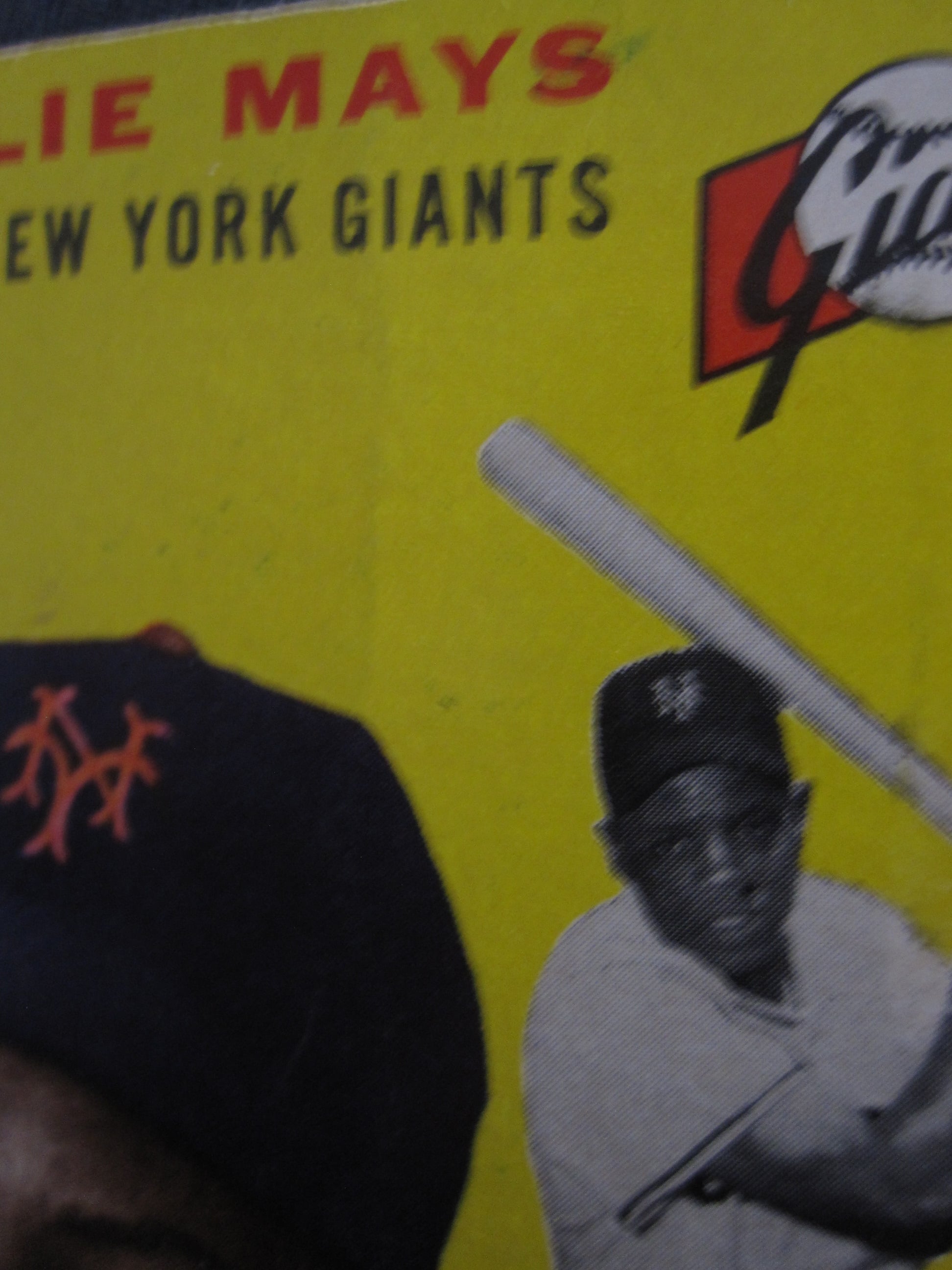 The Mays has a light crease from top to bottom. My third picture shows the crease from the G in Giants, down to his cap and to the bottom of the card.