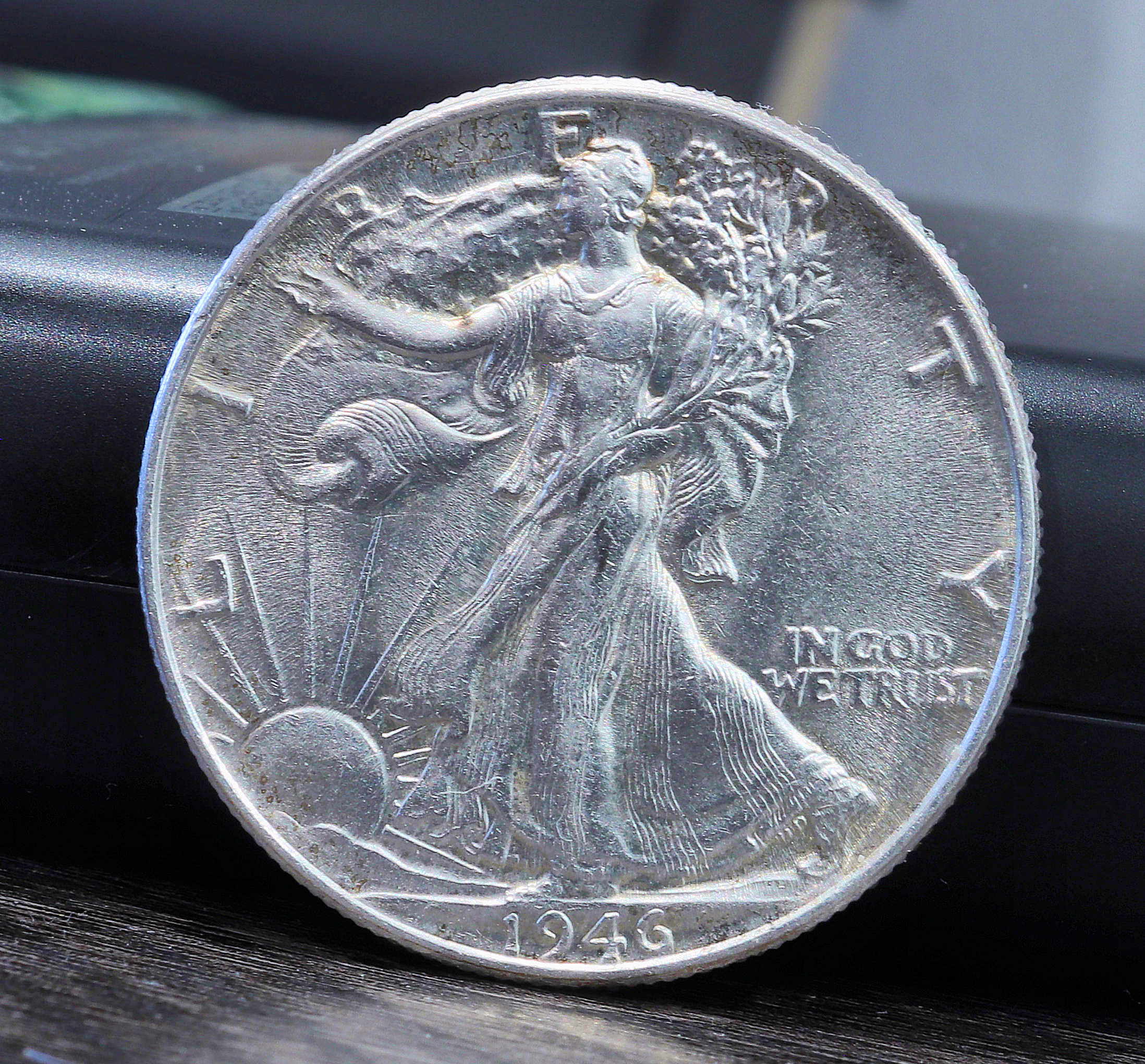My father was the coin expert and I like to go thru his collection once in a while. Recently I recently ran across this 1946 Walking Half which I believe may be a Double Die Reverse. The most noticeable doubling is on the motto e pluribus unum. Both sides show over-polished dies with the reverse being the worst. The designer's initials (Adolph Weinman) on the reverse is missing.