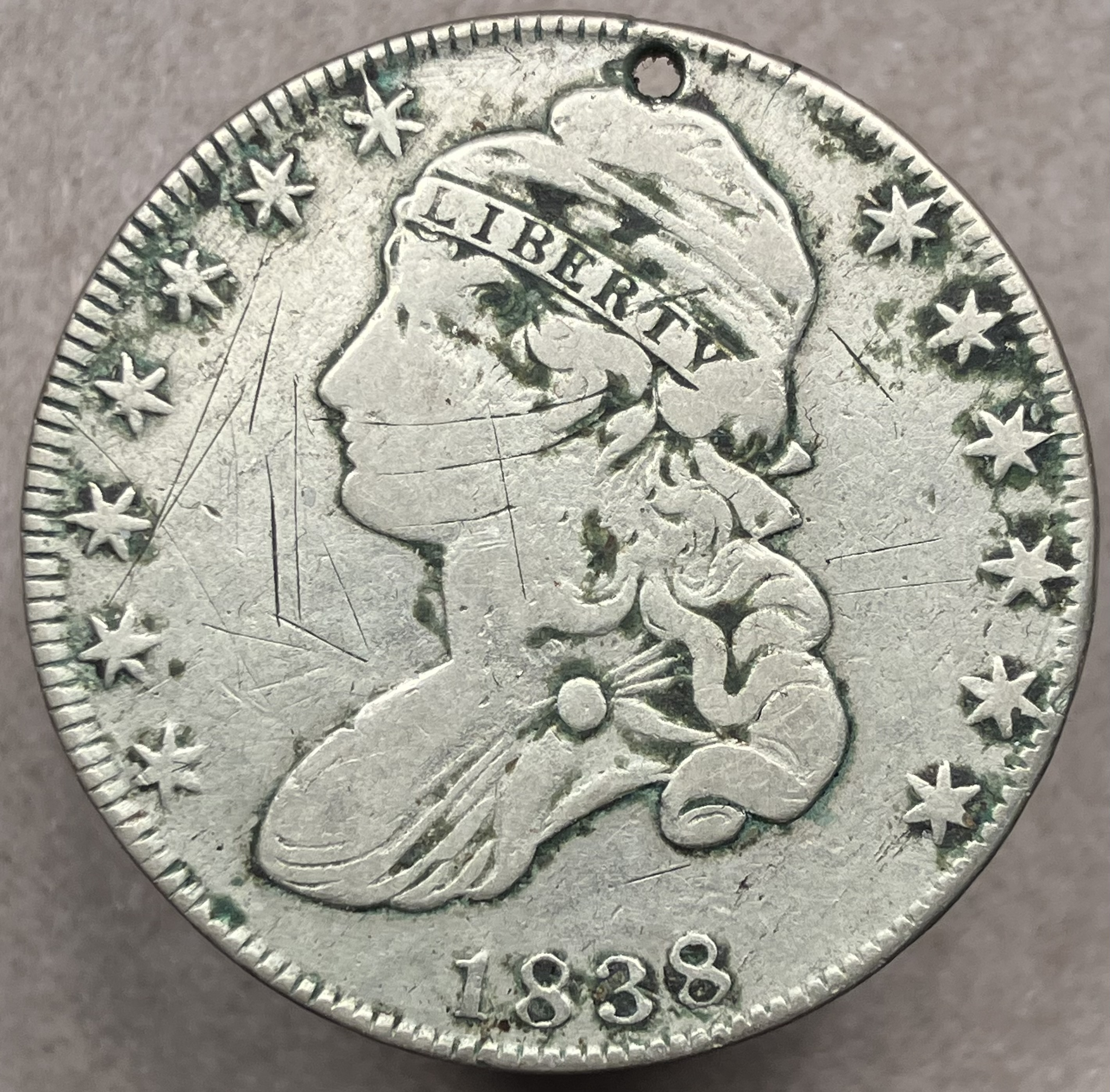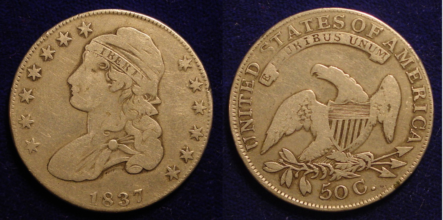 The first time was this 1837 Half dollar. It has a lettered edge. Of course the real thing has a reeded edge. it was like the counterfeits shown in Don Taxay's "Counterfeit and Mistruck" book from many years ago. I paid $15.