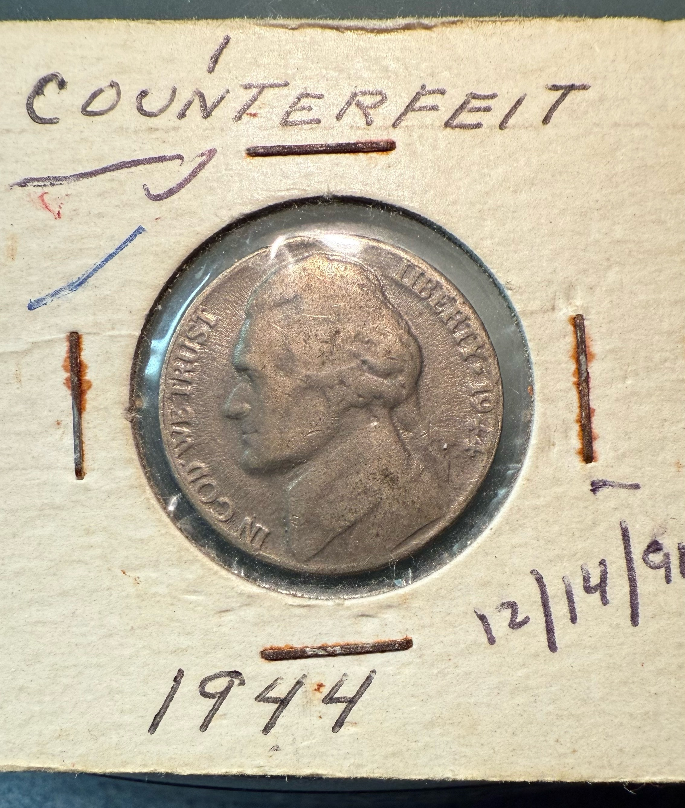 I was watching this "1944-P" Jefferson and threw a last second bid on it and won. When i first saw it, I had my suspicions about the OBV of Jefferson's hair being the wrong era in design. I compared it to some other 44-P's and the hair is too well defined. The legend lettering font looks off as well. And it is not silver. I am pretty sure there are other tale-tell signs. It will fit right in with rest of my fake 7070 Type Set.