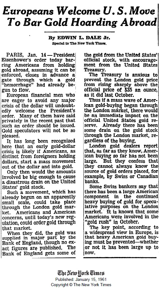 I was perusing the NY Times archives and came across this interesting article from March 1968. It followed one of those speedbumps in the international gold market and some of you who were around (I was, but too young