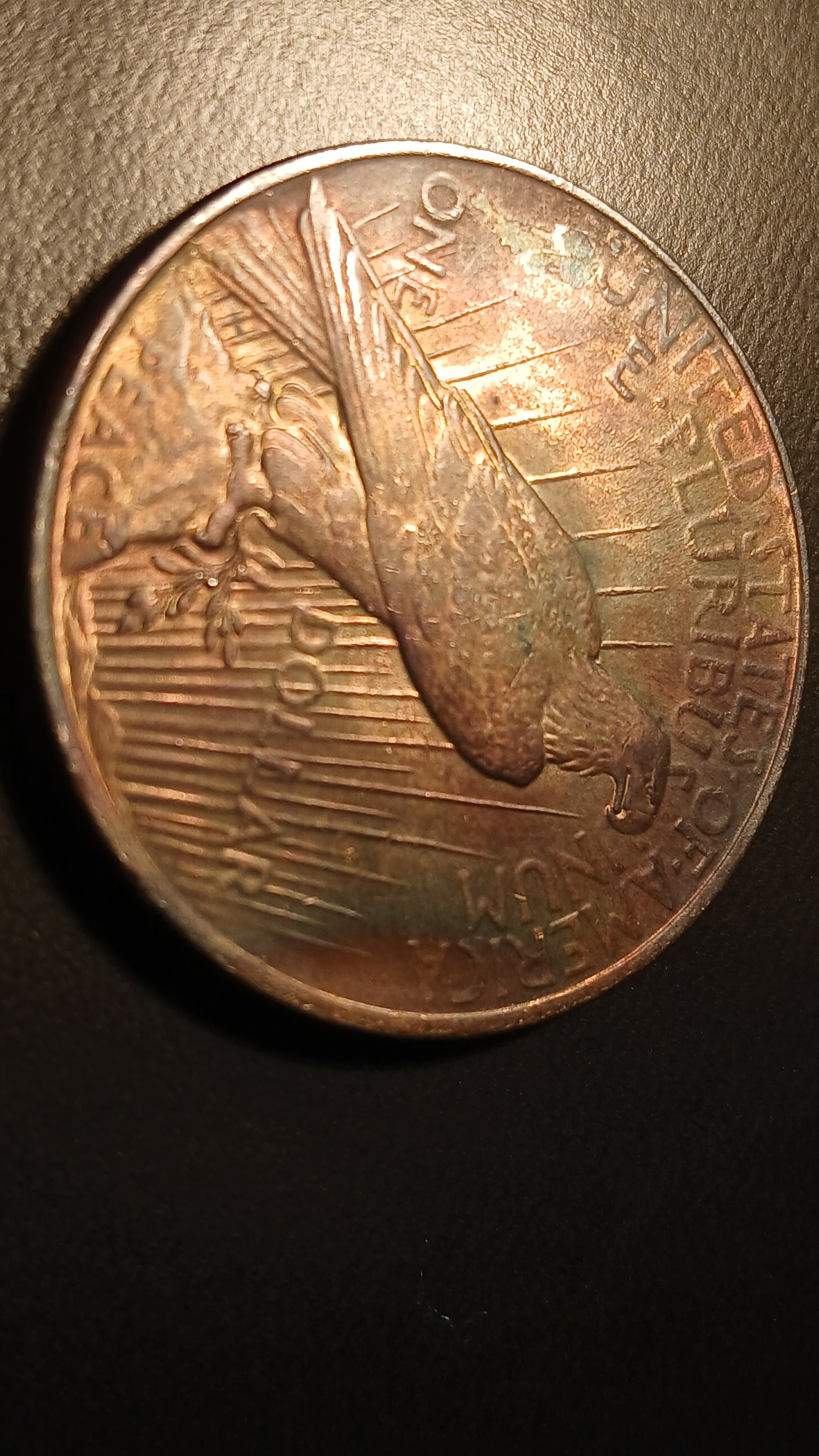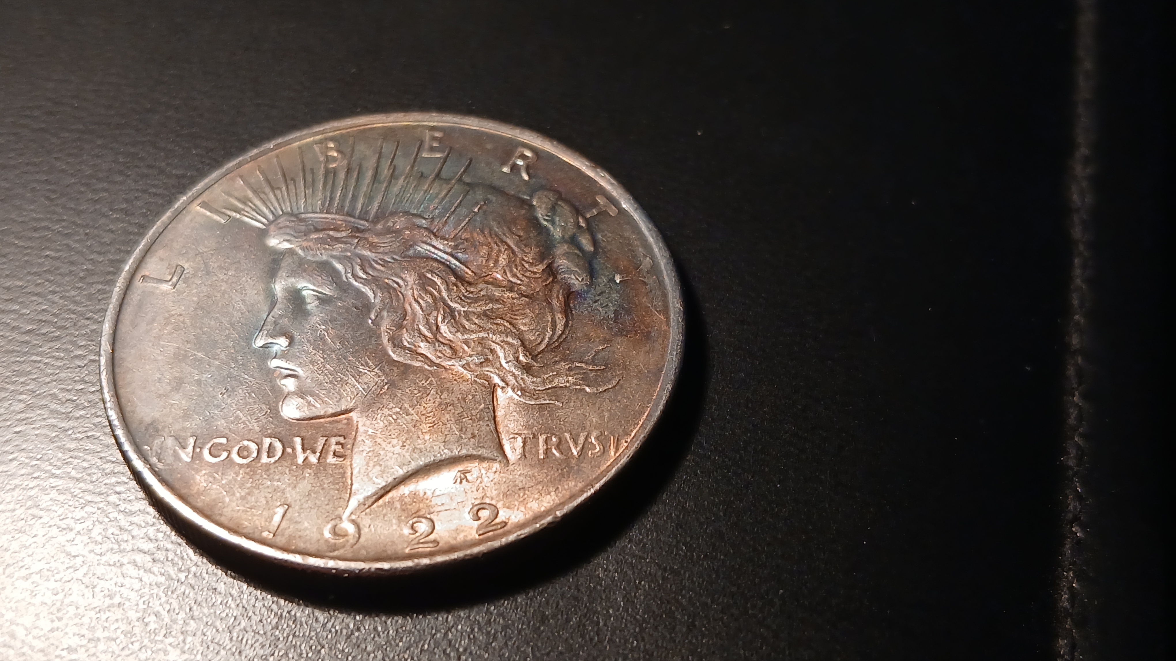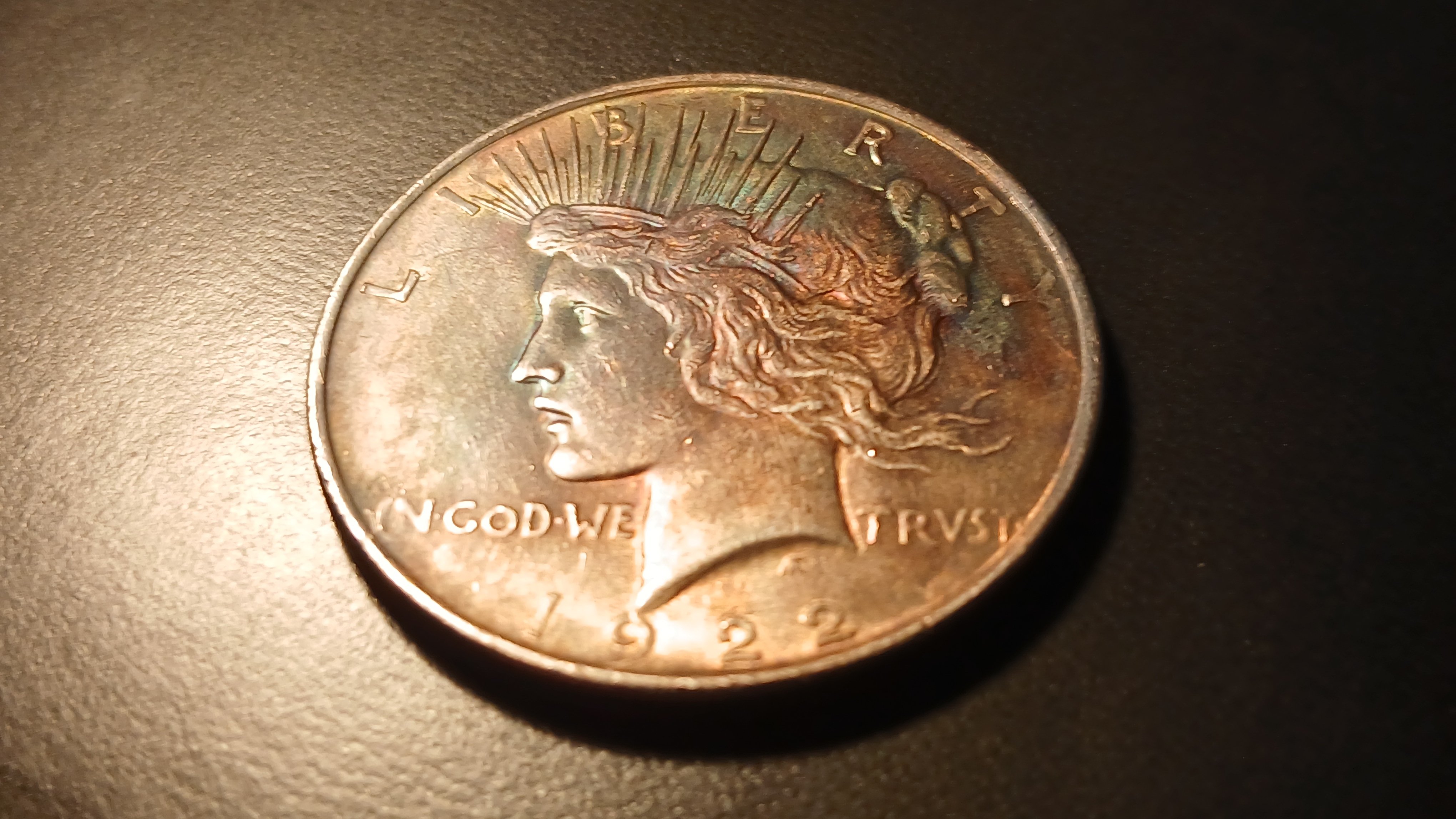 This looks like a fairly standard 1922 circulated peace dollar with questionable toning. Pictures aren’t good enough to hazard a guess on whether it’s been cleaned.