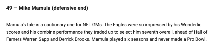 remember Tony Mandarich the "incredible bulk" and the 1989 draft? a 320 pound lineman who ran a 4.65 40? packers chose him number 2 overall because of his great combine.