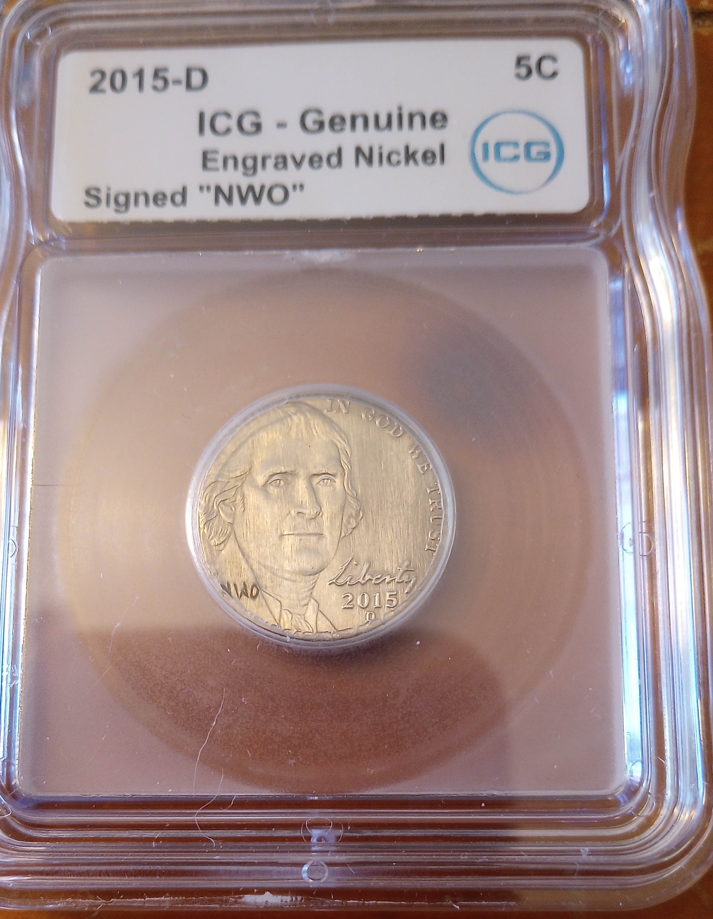 SOLD Hobo Moniker NWO. Carved on 2015-D Jefferson Nickel.